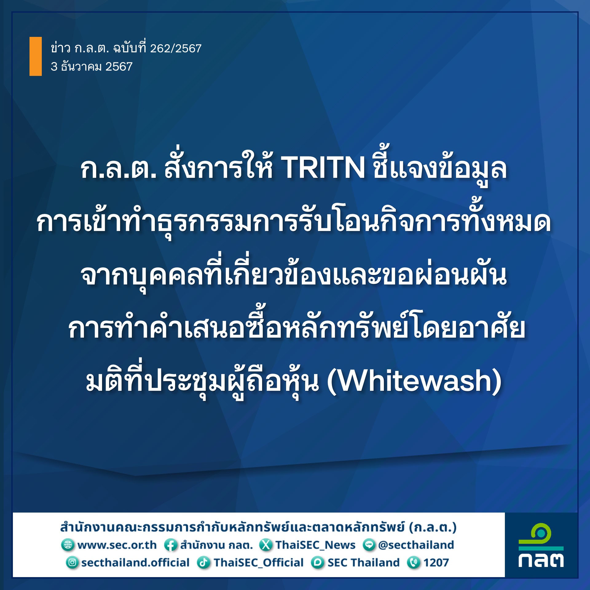 สำนักงานคณะกรรมการกำกับหลักทรัพย์และตลาดหลักทรัพย์ (ก.ล.ต.) สั่งการให้บริษัท ไทรทัน โฮลดิ้ง จํากัด (มหาชน) (TRITN) ชี้แจงข้อมูลภายในวันที่ 11 ธันวาคม 2567 กรณีคณะกรรมการบริษัทมีมติอนุมัติให้นำเสนอวาระเกี่ยวกับการได้มาซึ่งสินทรัพย์โดยการรับโอนกิจการทั้งหมดและออกหุ้นสามัญเพิ่มทุนให้แก่บุคคลในวงจำกัดกรณีที่มีนัยสำคัญซึ่งเข้าข่ายเป็นรายการเกี่ยวโยง การเพิ่มทุน การขอผ่อนผันการทำคำเสนอซื้อหลักทรัพย์ทั้งหมดของกิจการ (Whitewash) ต่อที่ประชุมวิสามัญผู้ถือหุ้น โดยคาดว่าจะจัดประชุมวันที่ 9 มกราคม 2568