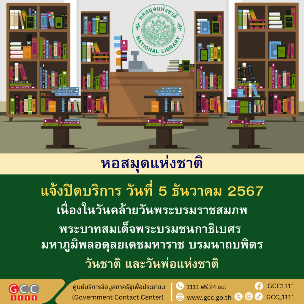 หอสมุดแห่งชาติ แจ้งปิดบริการ วันที่ 5 ธันวาคม 2567 เนื่องในวันคล้ายวันพระบรมราชสมภพ พระบาทสมเด็จพระบรมชนกาธิเบศร มหาภูมิพลอดุลยเดชมหาราช บรมนาถบพิตร วันชาติ และวันพ่อแห่งชาติ