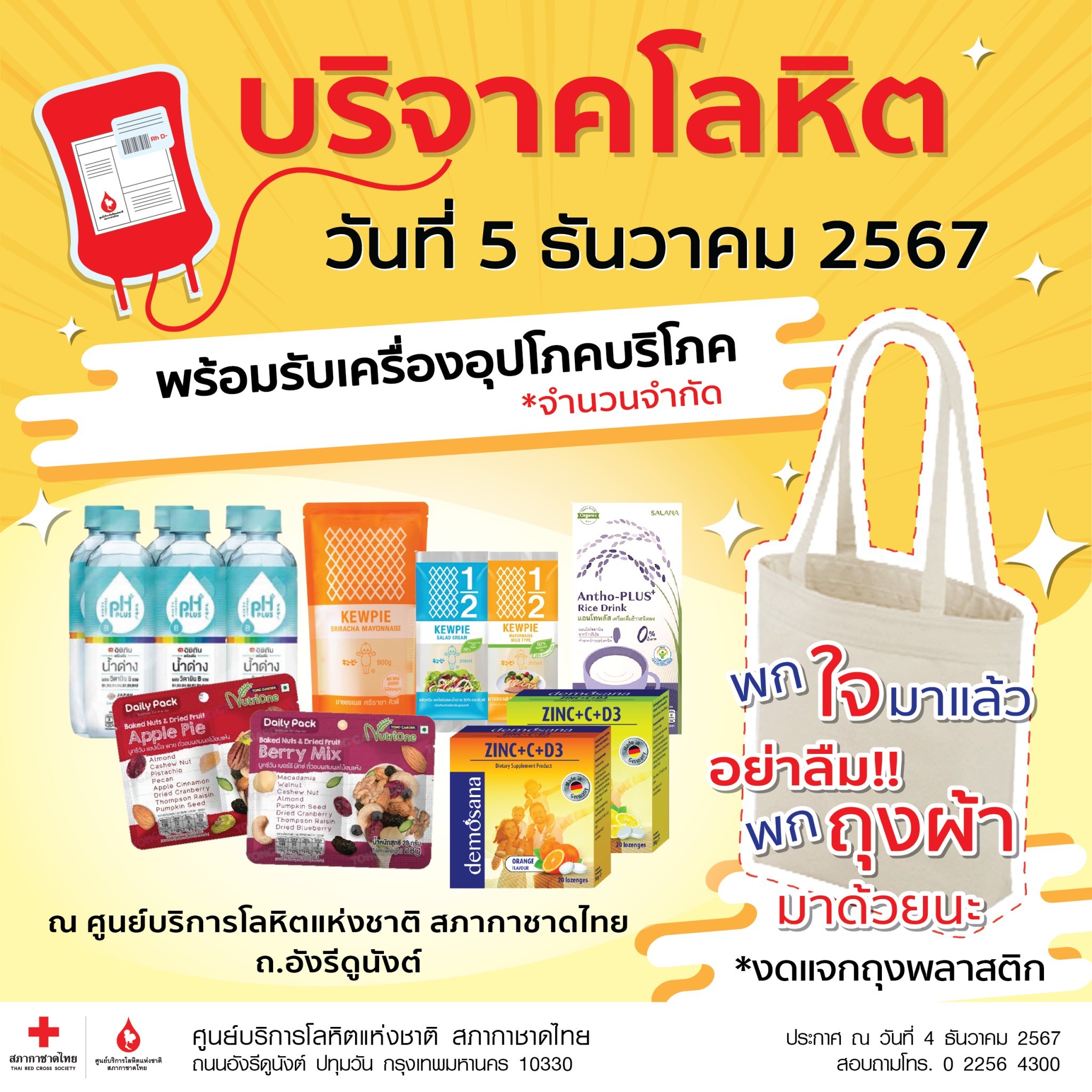 วันที่ 5 ธันวาคม 2567 #วันชาติ และวันพ่อแห่งชาติร่วมบริจาคโลหิต ณ ศูนย์บริการโลหิตแห่งชาติ สภากาชาดไทย รับทันที “เครื่องอุปโภคบริโภค” แบบจัดเต็มมีจำนวนจำกัด