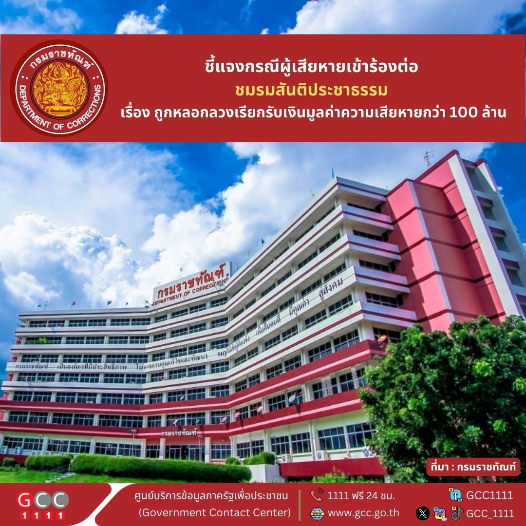 กรมราชทัณฑ์ ชี้แจงกรณีผู้เสียหายเข้าร้องต่อชมรมสันติประชาธรรม เรื่อง ถูกหลอกลวงเรียกรับเงินมูลค่าความเสียหายกว่า 100 ล้าน