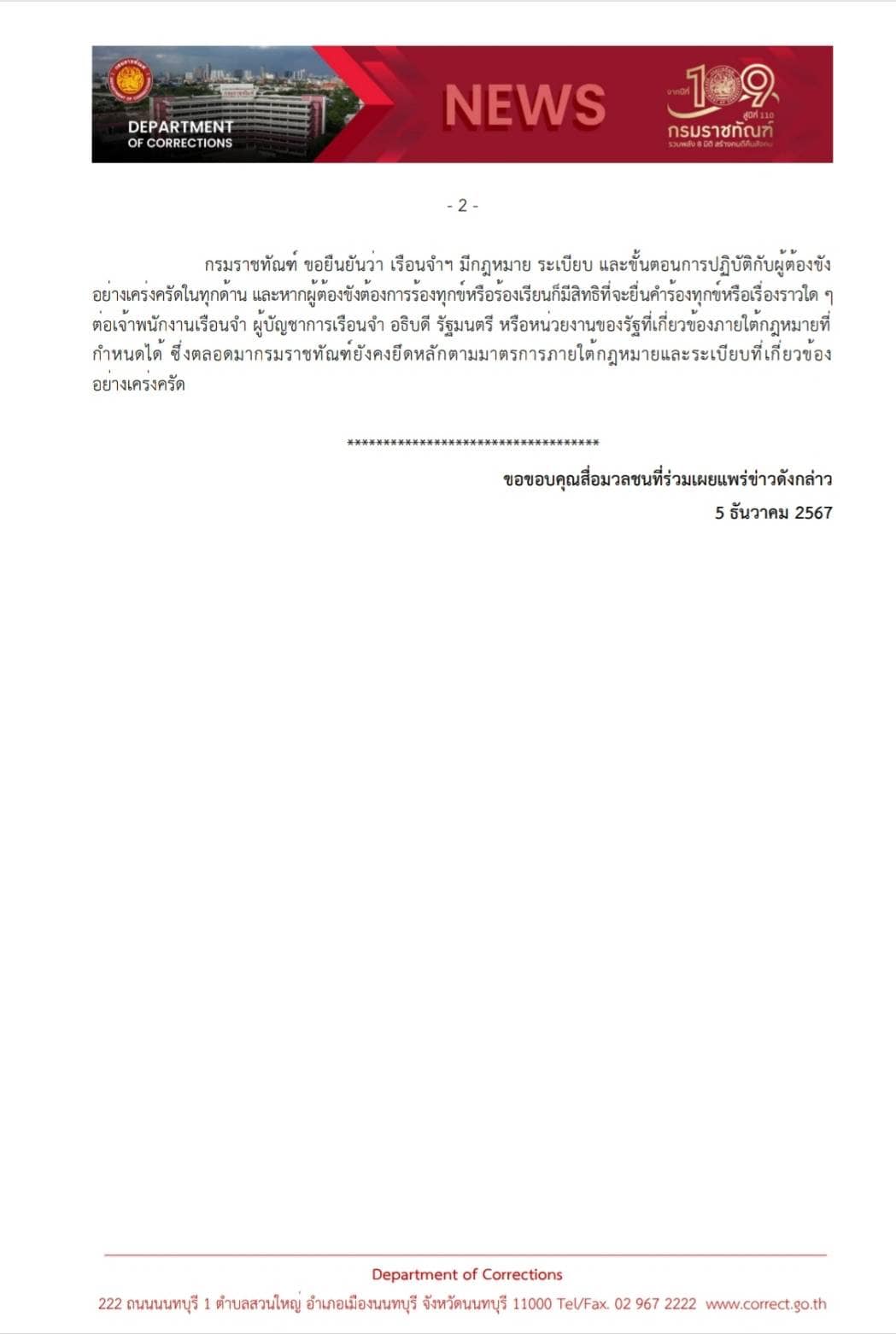 กรมราชทัณฑ์ ขอยืนยันว่า เรือนจําฯ มีกฎหมาย ระเบียบ และขั้นตอนการปฏิบัติกับผู้ต้องขัง อย่างเคร่งครัดในทุกด้าน และหากผู้ต้องขังต้องการร้องทุกข์หรือร้องเรียนก็มีสิทธิที่จะยื่นคําร้องทุกข์หรือเรื่องราวใด ๆ ต่อเจ้าพนักงานเรือนจํา ผู้บัญชาการเรือนจํา อธิบดี รัฐมนตรี หรือหน่วยงานของรัฐที่เกี่ยวข้องภายใต้กฎหมายที่ กําหนดได้ ซึ่งตลอดมากรมราชทัณฑ์ยังคงยึดหลักตามมาตรการภายใต้กฎหมายและระเบียบที่เกี่ยวข้องอย่างเคร่งครัด