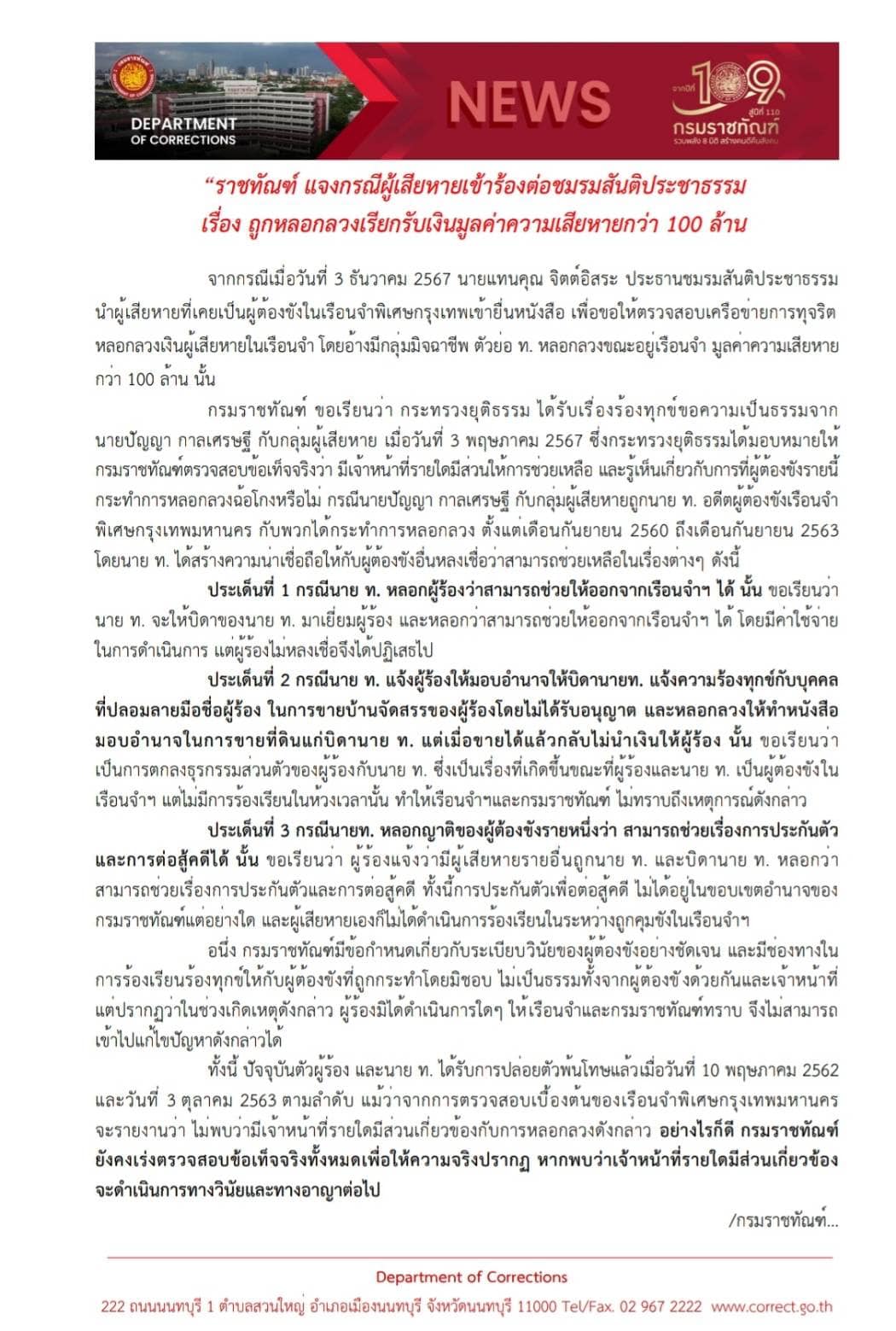 กรมราชทัณฑ์ แจงกรณีผู้เสียหายเข้าร้องต่อชมรมสันติประชาธรรม เรื่อง ถูกหลอกลวงเรียกรับเงินมูลค่าความเสียหายกว่า 100 ล้าน