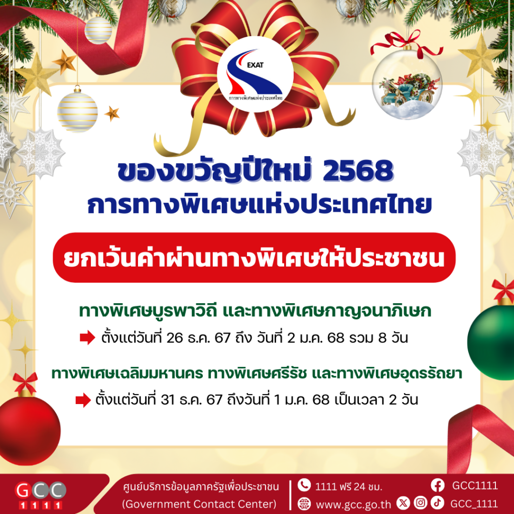 การทางพิเศษแห่งประเทศไทย ยกเว้นค่าผ่านทางในช่วงเทศกาลปีใหม่ 2568 ให้แก่ผู้ใช้ทางพิเศษ เพื่อเป็นของขวัญในช่วงเทศกาลปีใหม่ 2568