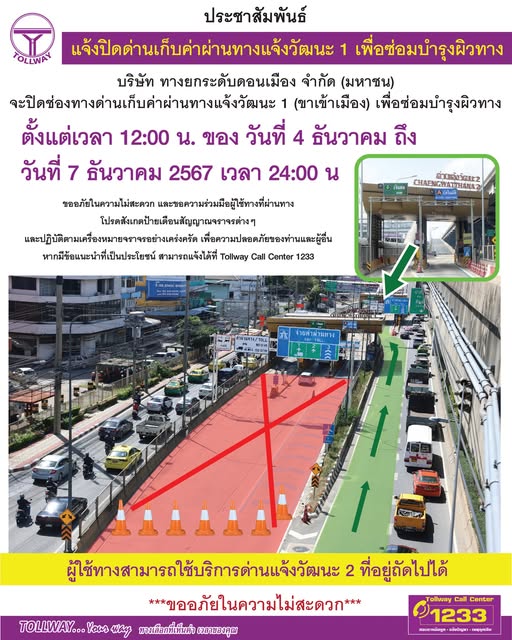 ดอนเมืองโทลล์เวย์ แจ้งปิดด่านเก็บค่าผ่านทางแจ้งวัฒนะ 1 (ขาเข้าเมือง) เพื่อซ่อมบำรุงผิวทาง ตั้งแต่เวลา 12.00 น. ของวันที่ 4 ธันวาคม ถึงวันที่ 7 ธันวาคม 2567 เวลา 24.00 น.