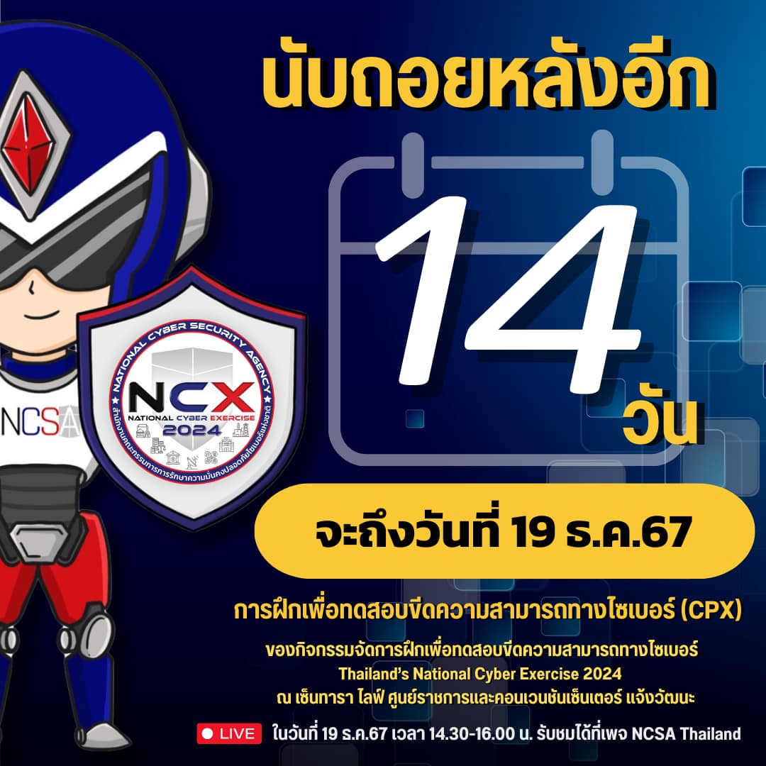 สำนักงานคณะกรรมการการรักษาความมั่นคงปลอดภัยไซเบอร์แห่งชาติ จัดการฝึกเพื่อทดสอบขีดความสามารถทางไซเบอร์ (Command Post Exercise: CPX) ในกิจกรรม Thailand’s National Cyber Exercise 2024 วันที่ 19 ธันวาคม 2567 เวลา 14.30 – 16.00 น. ณ เซ็นทารา ไลฟ์ ศูนย์ราชและคอนเวนชันเซ็นเตอร์ แจ้งวัฒนะ สามารถรับชมได้ที่ เพจ NCSA Thailand