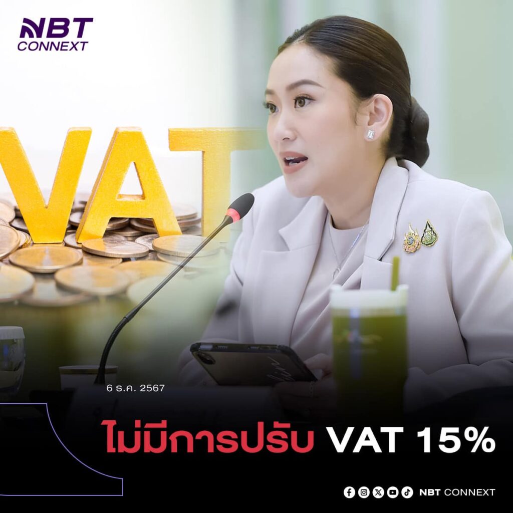 วันนี้ (6 ธันวาคม 2567) เวลา 14.30 น. นายจิรายุ ห่วงทรัพย์ โฆษกประจำสำนักนายกรัฐมนตรี เปิดเผยว่า นางสาวแพทองธาร ชินวัตร นายกรัฐมนตรี ได้เชิญผู้เกี่ยวข้องหารือในกรณีที่มีข่าวว่า รัฐบาลจะขึ้นภาษีมูลค่าเพิ่มหรือVAT เป็น15% ซึ่งประกอบไปด้วยนายพิชัย ชุณหวชิร รองนายกรัฐมนตรีและรัฐมนตรีว่าการกระทรวงการคลัง ร่วมกับคณะที่ปรึกษานโยบายของนายกรัฐมนตรี โดยได้ข้อสรุปดังนี้ นายกรัฐมนตรียืนยันว่า