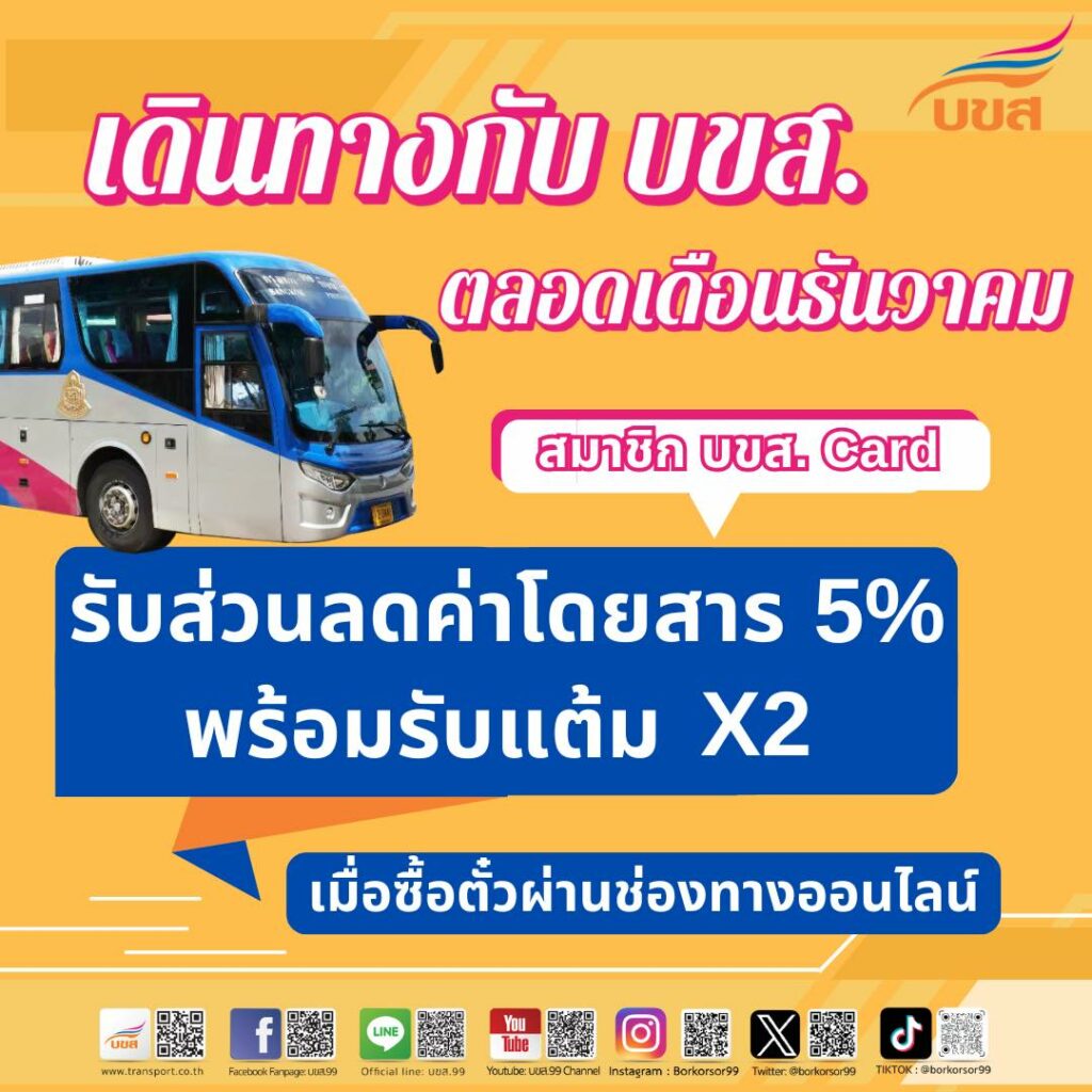 บขส. จัดโปรโมชั่น เดินทางตลอดเดือนธันวาคม สมาชิก บขส. Card รับส่วนลดค่าโดยสาร 5% พร้อมรับแต้ม X2