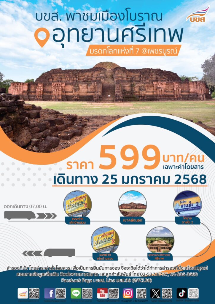 บริษัท ขนส่ง จำกัด เปิดจองตั๋วพาไปชมเมืองโบราณ อุทยานประวัติศาสตร์ศรีเทพ มรดกโลกแห่งที่ 7 จังหวัดเพชรบูรณ์ โดยเดินทางวันที่ 25 มกราคม 2568 ค่าตั๋วเพียง 599 บาท/คน เท่านั้น (ราคานี้ไม่รวมค่าธรรมเนียม) รถจะออกจากสถานีขนส่งผู้โดยสารกรุงเทพ (จตุจักร) หรือ หมอชิต 2 เวลา 07.00 น.