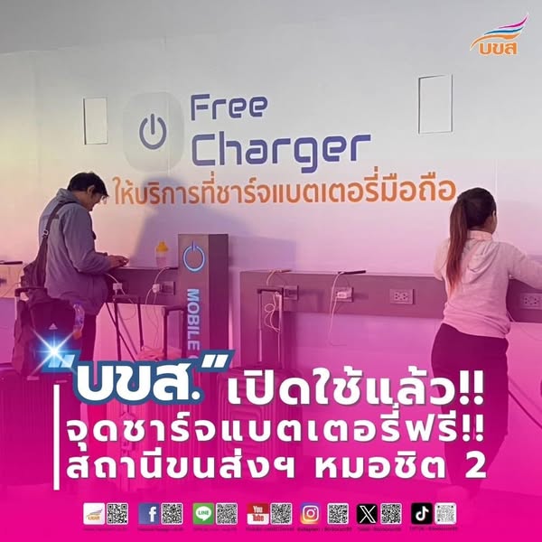 บริษัท ขนส่ง จำกัด เปิดบริการจุดชาร์จแบตเตอรี่มือถือฟรีภายในสถานีขนส่งหมอชิต 2 โดยติดตั้งทั้งหมด 5 จุด ได้แก่ ชั้น 1 จำนวน 3 จุด และชั้น 3 จำนวน 2 จุด เพื่ออำนวยความสะดวกแก่ประชาชน และยกระดับการบริการภายในสถานีให้ทันสมัย สะดวก และปลอดภัยมากยิ่งขึ้น.