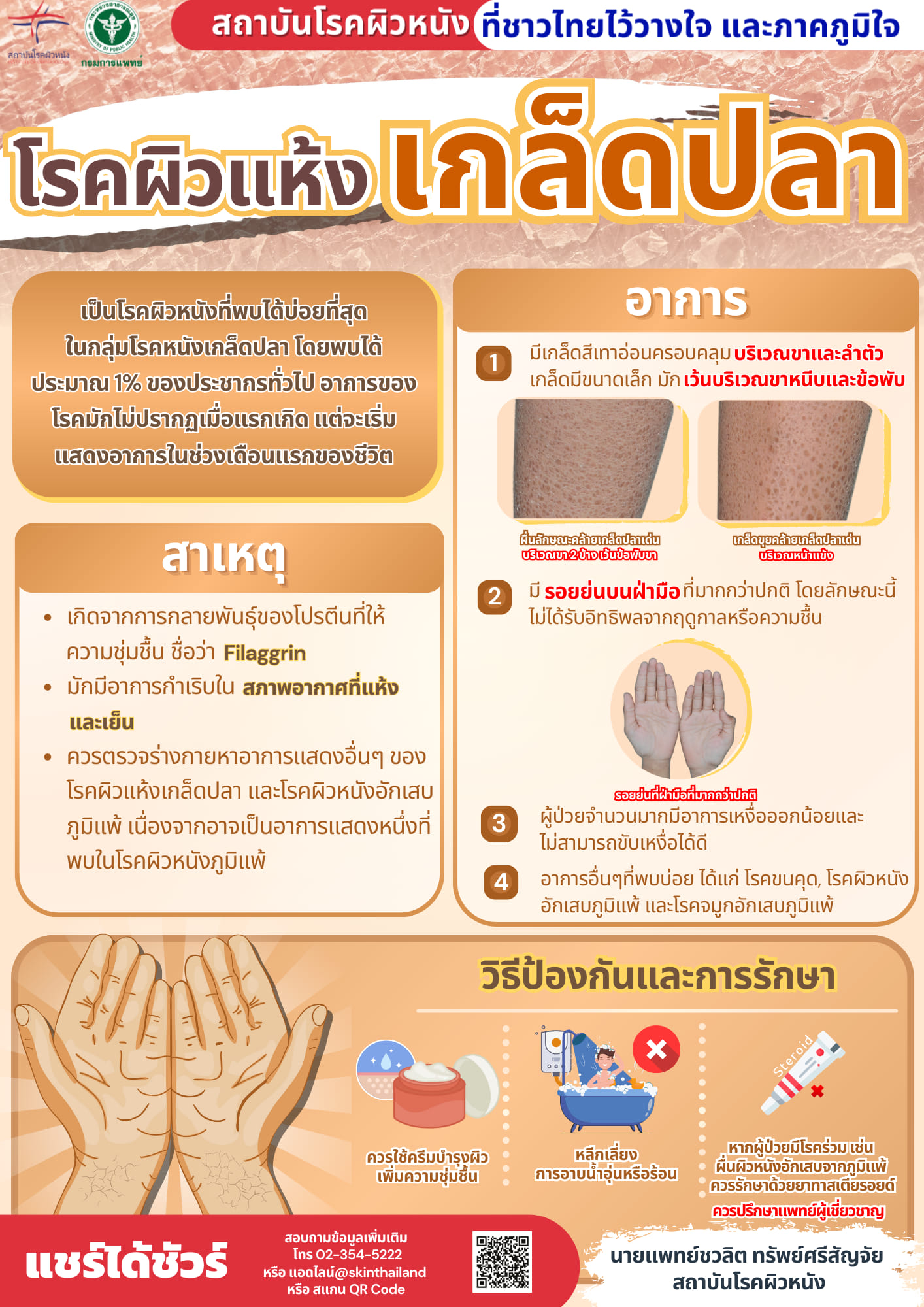 นายแพทย์สกานต์ บุนนาค รองอธิบดีกรมการแพทย์ กล่าวว่า โรคผิวแห้งเกล็ดปลา (Ichthyosis vulgaris) เป็นโรคผิวหนังที่พบได้บ่อยที่สุดในกลุ่มโรคหนังเกล็ดปลา (Ichthyosis) โดยพบได้ประมาณ 1% ของประชากรทั่วไป ซึ่งอาการของโรคมักจะไม่ปรากฏเมื่อตอนแรกเกิด แต่จะเริ่มแสดงอาการในช่วง 1 เดือนแรก สาเหตุของโรคผิวแห้งเกล็ดปลา (Ichthyosis vulgaris) เกิดจากการกลายพันธุ์ของโปรตีนที่ให้ความชุ่มชื้นชื่อว่า Filaggrin อาการผิวแห้งเกล็ดปลามักมีอาการกำเริบในช่วงฤดูหนาวที่มีสภาพอากาศที่แห้งและเย็น และอาการจะดีขึ้นในช่วงฤดูร้อนหรือฤดูฝนที่มีสภาพอากาศที่อบอุ่นและชื้น ซึ่งผู้ป่วยส่วนใหญ่ตอบสนองได้ดีต่อการใช้สารให้ความชุ่มชื้น