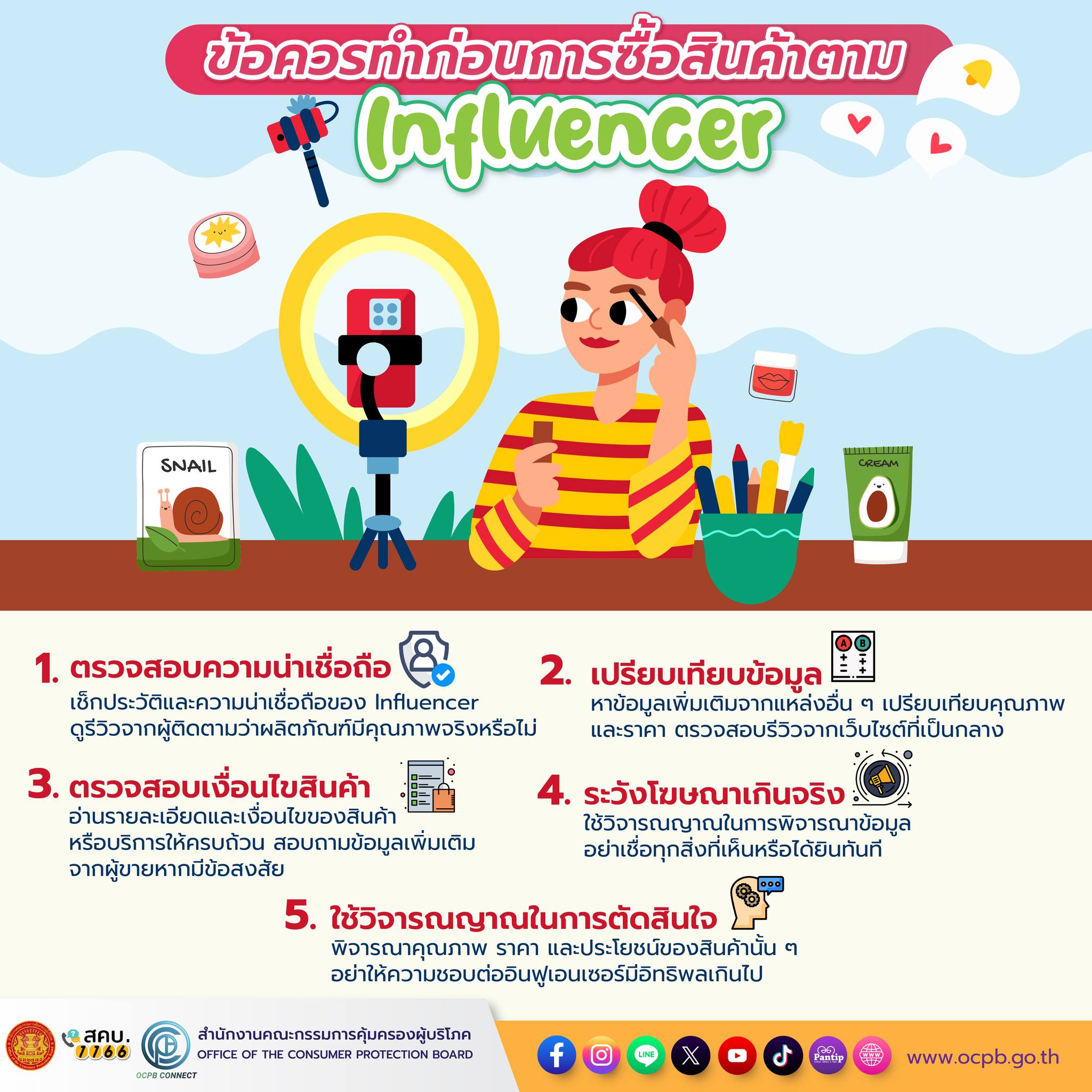 สำนักงานคณะกรรมการคุ้มครองผู้บริโภค แนะนำ ข้อพึงระวังในการซื้อสินค้าตาม Influencer ดังนี้