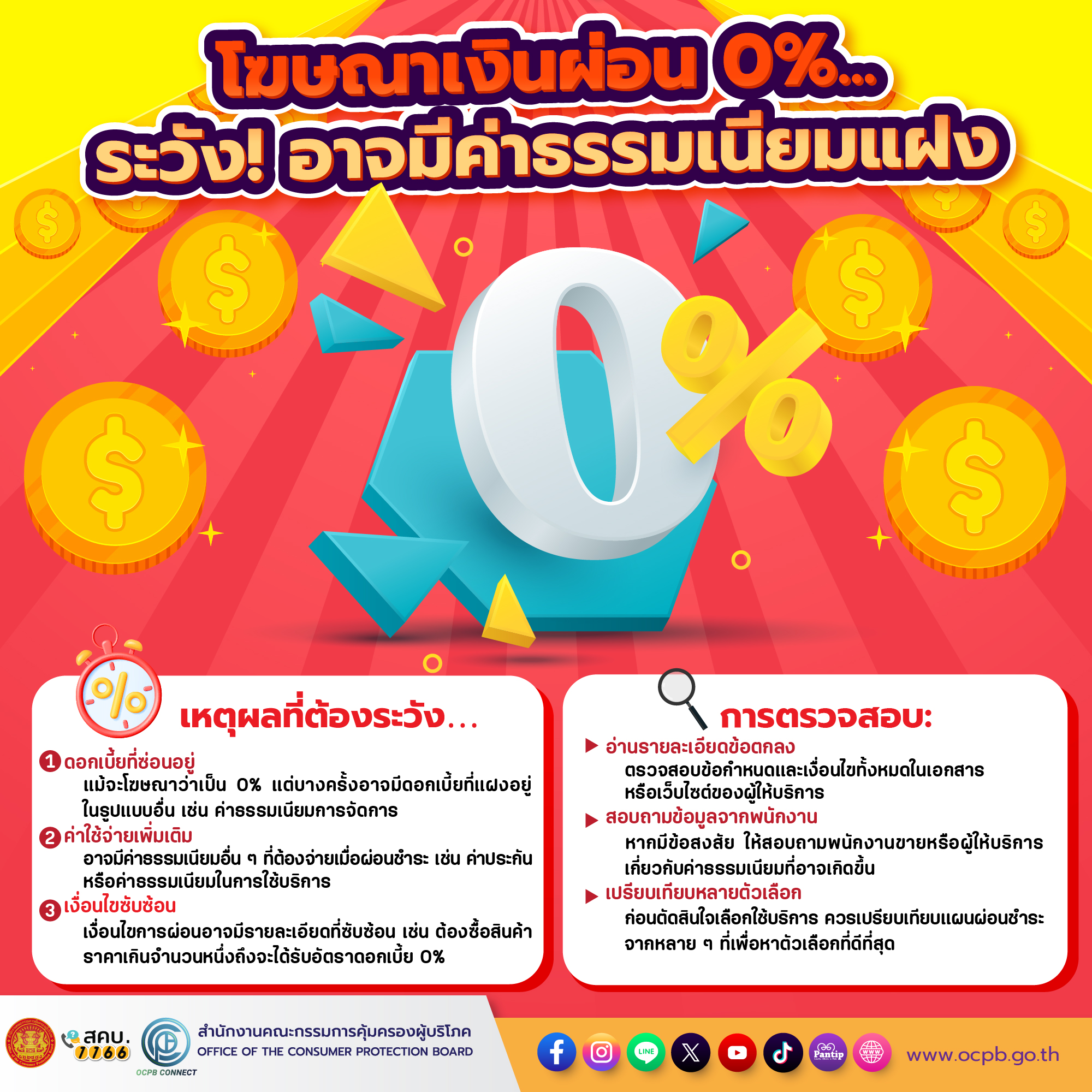 สำนักงานคณะกรรมการคุ้มครองผู้บริโภค เตือนโฆษณาเงินผ่อน 0% ระวังอาจมีค่าธรรมเนียมแฝง