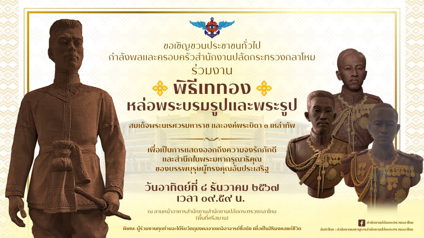 สำนักงานปลัดกระทรวงกลาโหม ขอเชิญชวนพี่น้องประชาชนร่วมพิธีเททองหล่อพระบรมรูปสมเด็จพระนเรศวรมหาราช, พระรูปจอมพลสมเด็จเจ้าฟ้าฯ กรมหลวงพิษณุโลกประชานาถ, จอมพล พระเจ้าบรมวงศ์เธอพระองค์เจ้าจิรประวัติวรเดช กรมหลวงนครไชยศรีสุรเดช และ พลเรือเอก พระเจ้าบรมวงศ์เธอพระองค์เจ้าอาภากร เกียรติวงศ์ กรมหลวงชุมพรเขตอุดมศักดิ์ เพื่อเป็นการแสดงออกถึงความจงรักภักดีและสำนึกในพระมหากรุณาธิคุณของบรรพบรษผู้ทรงคณอันประเสริฐ ในวันอาทิตย์ที่ 8 ธันวาคม 2567 เวลา 09.59 น. ณ ลานหน้าอาคารสำนักงานสำนักงานปลัดกระทรวงกลาโหม (พื้นที่ศรีสมาน)