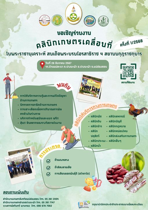 สำนักงานเกษตรจังหวัดแม่ฮ่องสอน เชิญชวนร่วมงาน โครงการคลินิกเกษตรเคลื่อนที่ในพระราชานุเคราะห์ สมเด็จพระบรมโอรสาธิราช ฯ สยามมกุฏราชกุมาร ครั้งที่ 1/2568 วันที่ 26 ธันวาคม 2567 เวลา 08.00 น. เป็นต้นไป ณ โรงเรียนบ้านแม่ละนา ต.ปางมะผ้า อ.ปางมะผ้า จ.แม่ฮ่องสอน