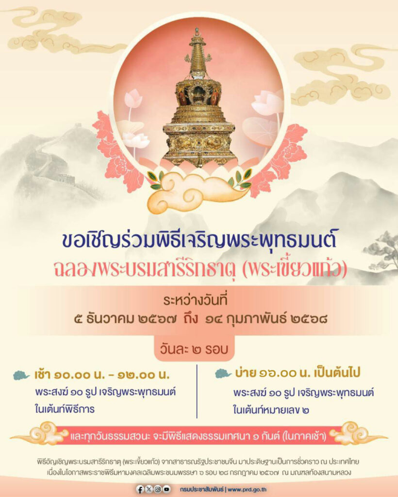 รัฐบาล ขอเชิญประชาชนร่วมพิธีเจริญพระพุทธมนต์ฉลองพระบรมสารีริกธาตุ (พระเขี้ยวแก้ว) ระหว่างวันที่ 5 ธันวาคม 2567 – 14 กุมภาพันธ์ 2568 วันละ 2 รอบ