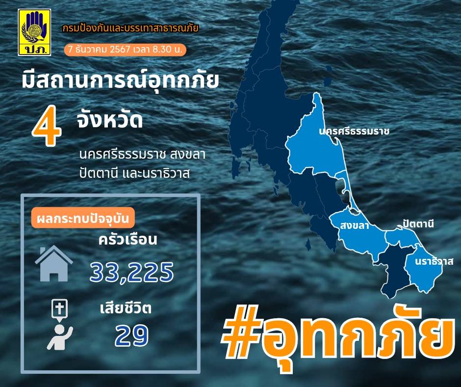 (7 ธ.ค. 67) เวลา 8.30 น. ปภ.เผยมีสถานการณ์อุทกภัยในพื้นที่ 4 จังหวัด ได้แก่ นครศรีธรรมราช สงขลา ปัตตานี และนราธิวาส รวม 13 อำเภอ 63 ตำบล 440 หมู่บ้าน ประชาชนได้รับผลกระทบ 33,225 ครัวเรือน มีผู้เสียชีวิต 29 ราย เจ้าหน้าที่ชุดปฏิบัติการพร้อมเครื่องจักรกลสาธารณภัยเร่งสูบระบายน้ำออกจากพื้นที่ เร่งช่วยเหลือและบรรเทาความเดือดร้อนของประชาชนที่ได้รับผลกระทบ