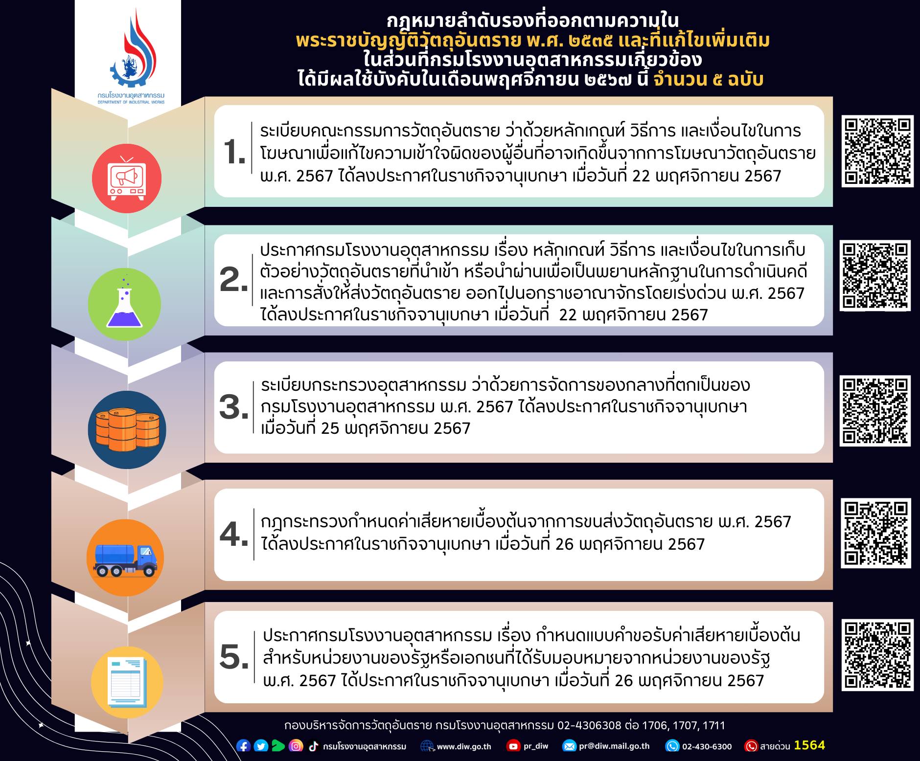 กรมโรงงานอุตสาหกรรม แจ้งกฎหมายลำดับรองที่ออกตามความในพระราชบัญญัติวัตถุอันตราย พ.ศ. 2535 และที่แก้ไขเพิ่มเติม ในส่วนที่ กรมโรงงานอุตสาหกรรม เกี่ยวข้อง มีผลใช้บังคับในเดือนพฤศจิกายน 2567 จำนวน 5 ฉบับ