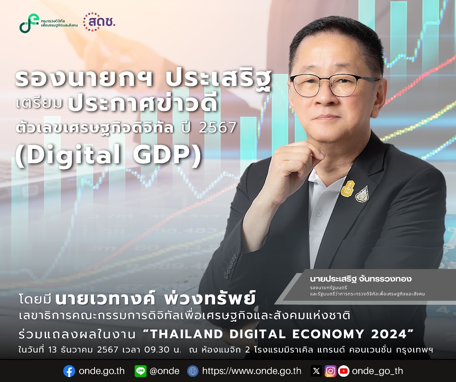 รองนายกฯ ประเสริฐ เตรียมประกาศข่าวดี ตัวเลขเศรษฐกิจดิจิทัล ปี 2567 (Digital GDP) โดยมีนายเวทาง พ่วงทรัพย์ เลขาธิการคณะกรรมการดิจิทัลเพื่อเศรษฐกิจและสังคมแห่งชาติ ร่วมแถลงผลงานใน “Thailand Digital Economy 2024”