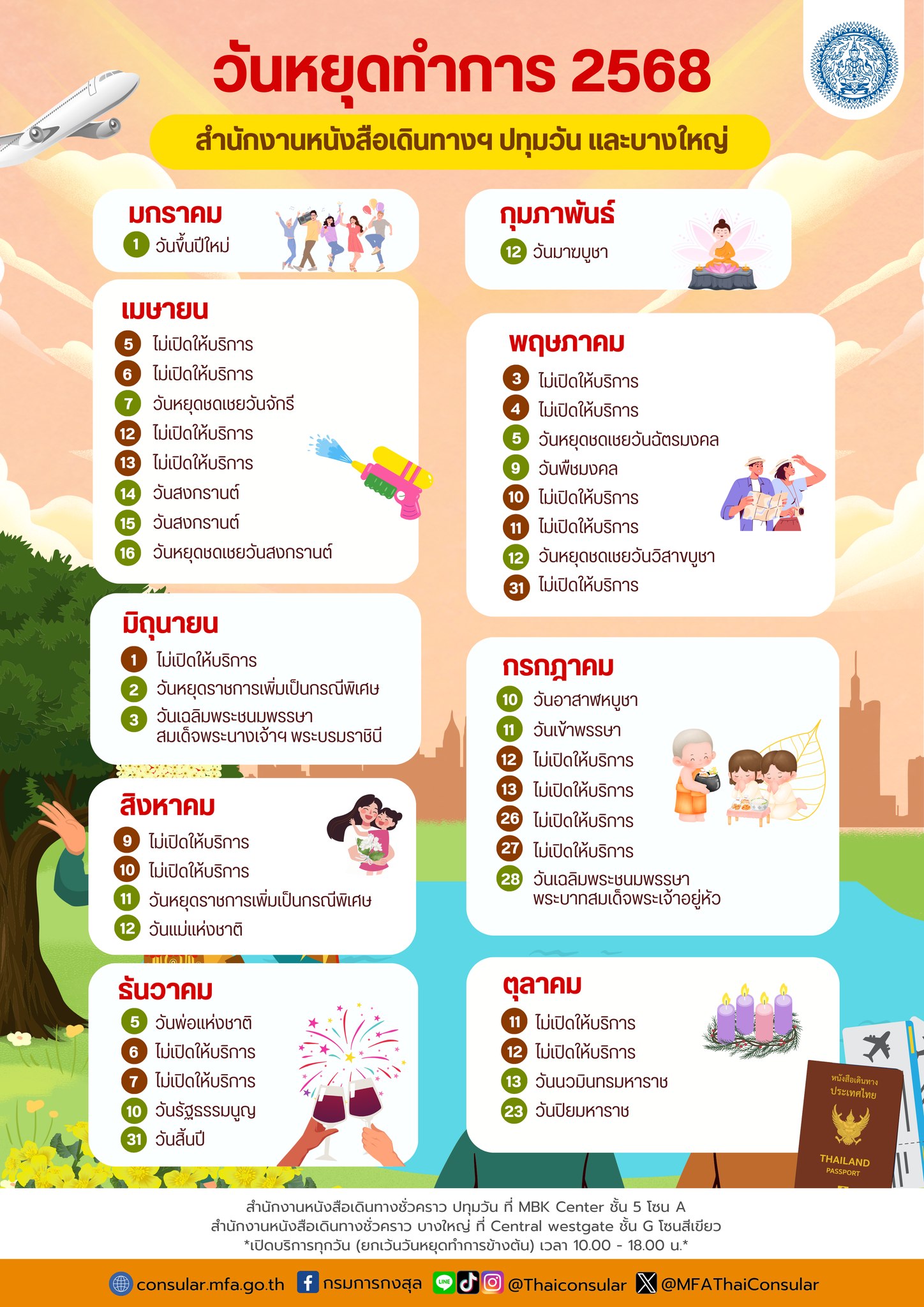วันหยุดทำการ ปี 2568 ของกรมการกงสุล และสำนักงานหนังสือเดินทางชั่วคราว ทั่วประเทศ ยกเว้นสำนักงานหนังสือเดินทางชั่วคราว ปทุมวัน และ บางใหญ่