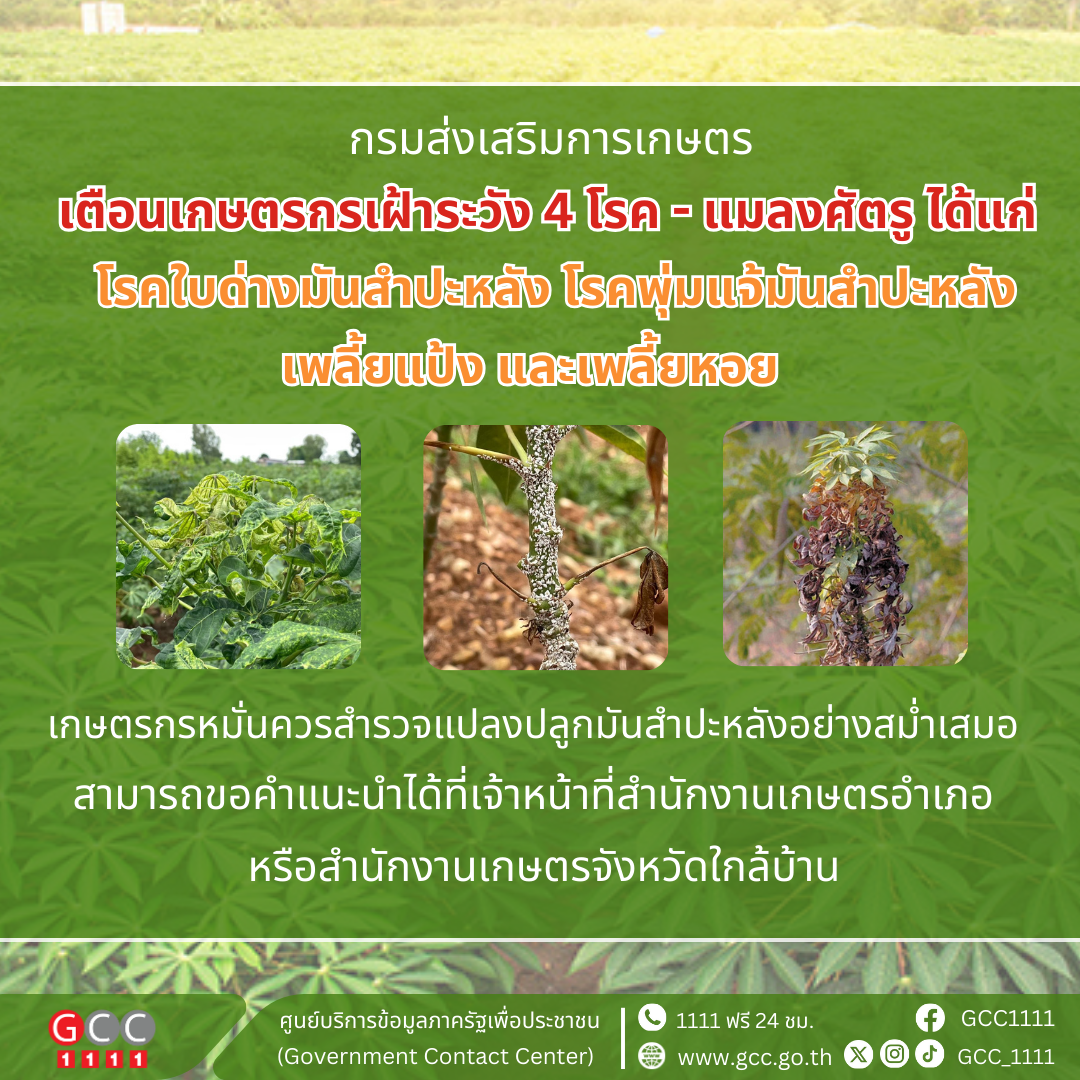 กรมส่งเสริมการเกษตร เตือนเกษตรกร เฝ้าระวังการระบาดโรคและแมลงที่ติดไปกับท่อนพันธุ์มันสำปะหลัง เนื่องจากปัจจุบันอยู่ในช่วงปลูกมันสำปะหลังปลายฝนหรือฤดูแล้ง ได้แก่ โรคใบด่างมันสำปะหลัง โรคพุ่มแจ้มันสำปะหลัง เพลี้ยแป้ง และเพลี้ยหอย ทั้งนี้ กรมส่งเสริมการเกษตรเน้นย้ำให้เกษตรกรหมั่นสำรวจแปลงปลูกมันสำปะหลังอย่างสม่ำเสมอ หากพบการระบาดให้ดำเนินการควบคุมและป้องกันกำจัดก่อนเกิดการระบาดรุนแรงหรือสามารถขอคำแนะนำ ได้ที่ เจ้าหน้าที่สำนักงานเกษตรอำเภอ หรือสำนักงานเกษตรจังหวัดใกล้บ้าน