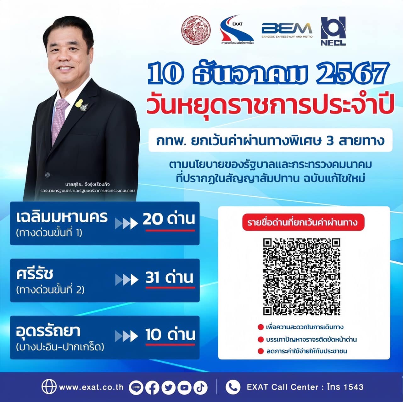 การทางพิเศษแห่งประเทศไทย ยกเว้นค่าผ่านทางพิเศษ 3 สายทาง วันที่ 10 ธันวาคม 2567