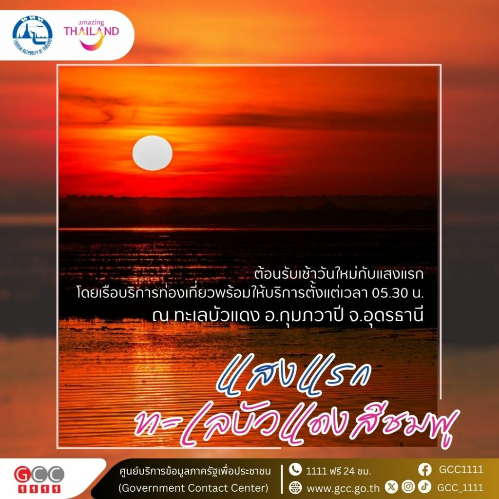 การท่องเที่ยวแห่งประเทศไทย สำนักงานอุดรธานี เชิญชมทะเลบัวแดงสีชมพู ต้อนรับเช้าวันใหม่กับแสงแรก ช่วงที่บานสะพรั่งที่สุดคือ ประมาณวันที่ 15 ธันวาคม 2567 ณ ทะเลบัวแดง อ.กุมภวาปี จ.อุดรธานี โดยเรือบริการท่องเที่ยวพร้อมให้บริการตั้งแต่เวลา 05.30 น.