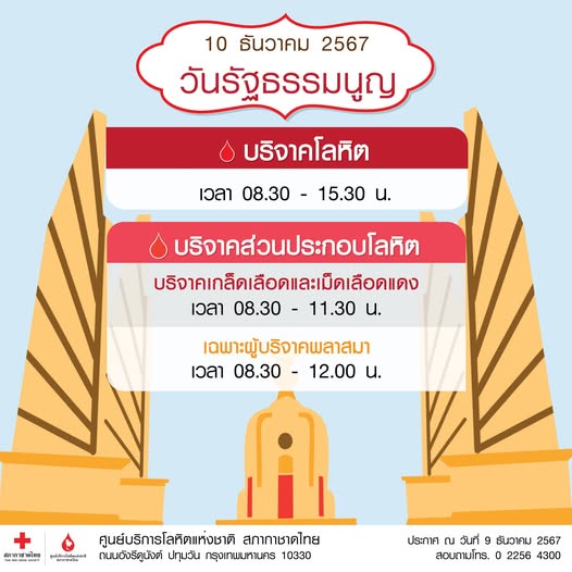ศูนย์บริการโลหิตแห่งชาติ สภากาชาดไทย เปิดรับบริจาคโลหิต วันที่ 10 ธันวาคม 2567 (วันรัฐธรรมนูญ) ตั้งแต่เวลา 08.30 – 15.30 น.