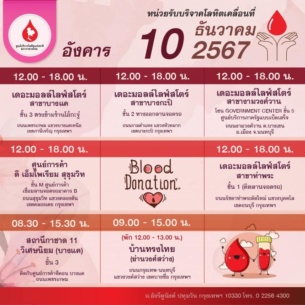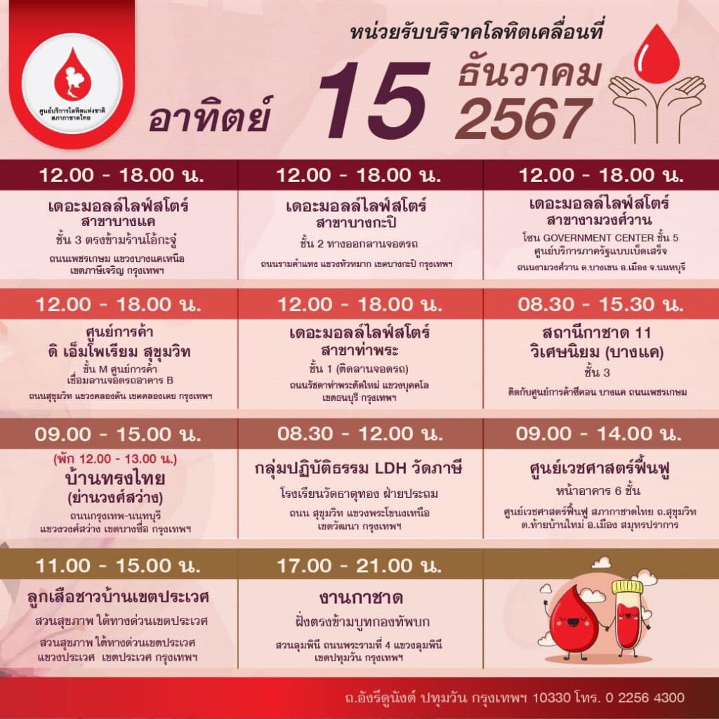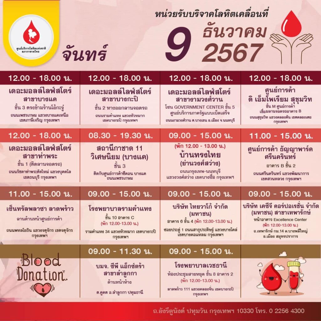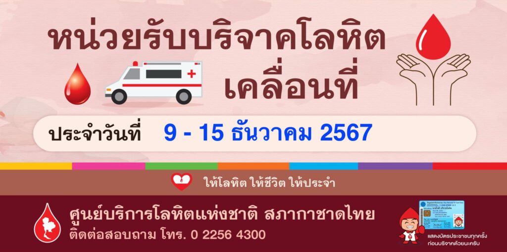 สภากาชาดไทย ออกหน่วยรับบริจาคโลหิตเคลื่อนที่ วันที่ 9 – 15 ธันวาคม 2567