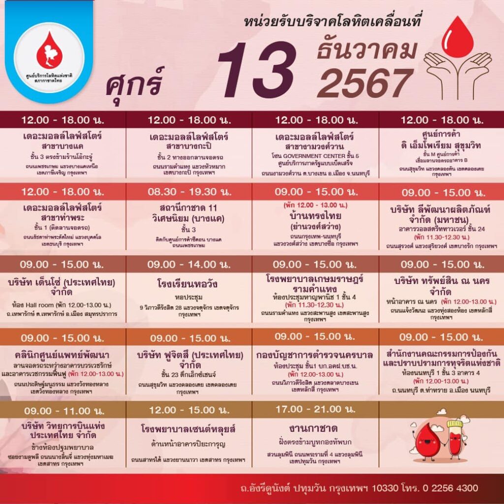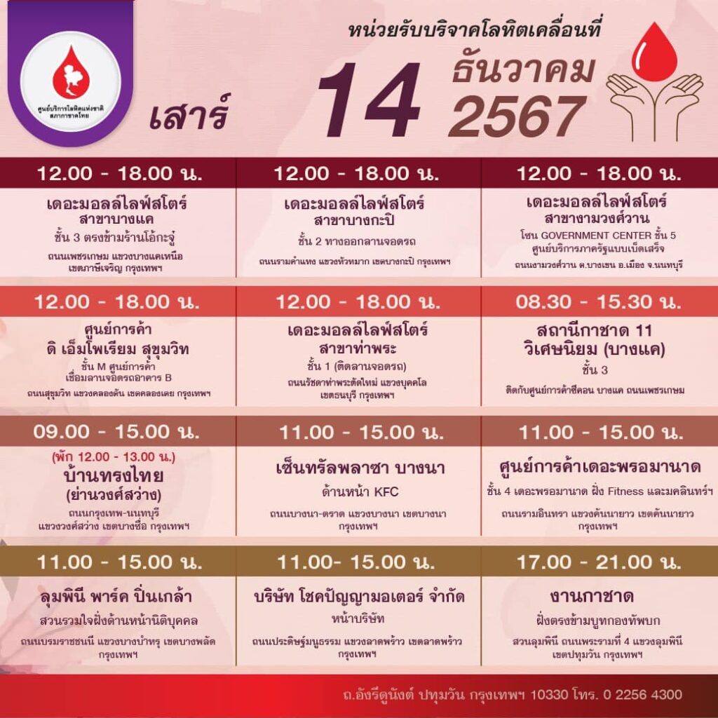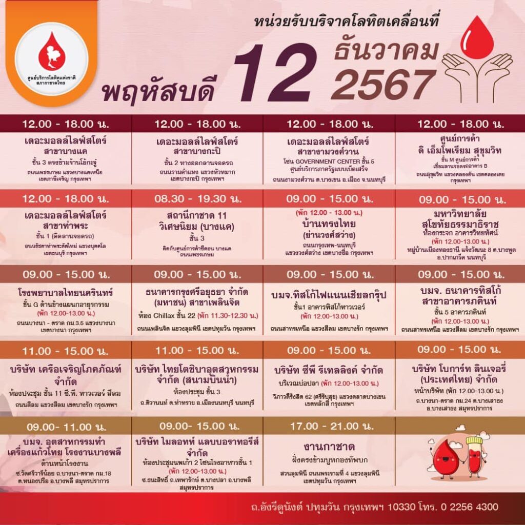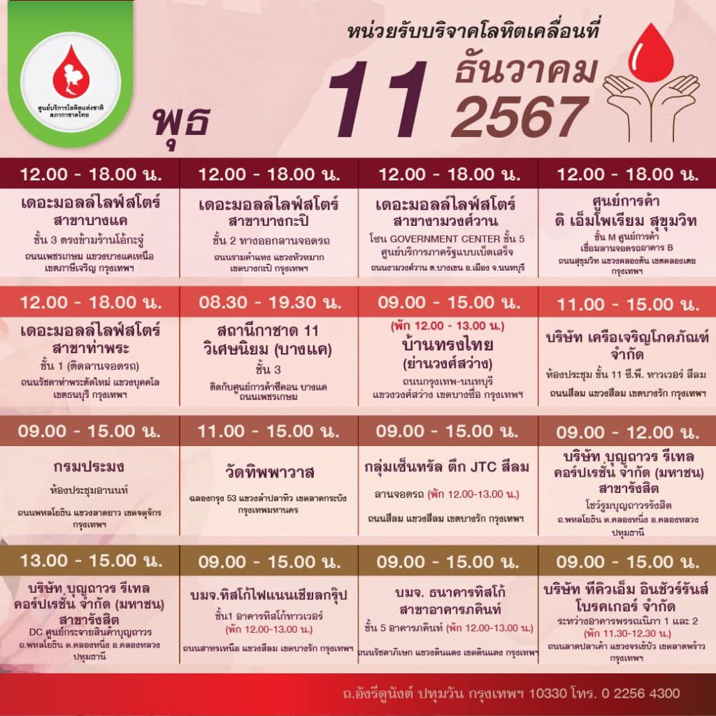 สภากาชาดไทย ออกหน่วยรับบริจาคโลหิตเคลื่อนที่ วันที่ 9 – 15 ธันวาคม 2567