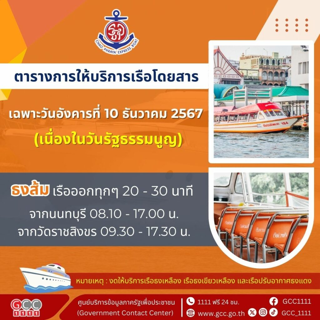 เรือด่วนเจ้าพระยา แจ้งตารางการให้บริการเรือโดยสาร เฉพาะวันอังคารที่ 10 ธันวาคม 2567