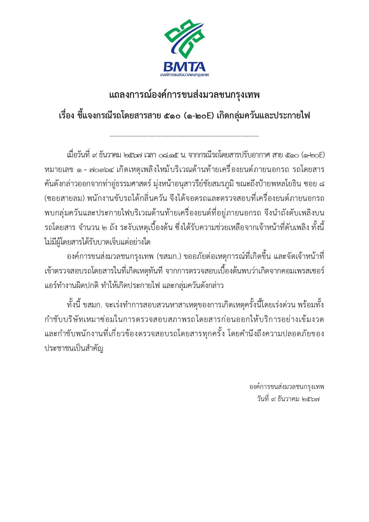 องค์การขนส่งมวลชนกรุงเทพ แถลงการณ์องค์การขนส่งมวลชนกรุงเทพ เรื่อง ชี้แจงกรณีรถโดยสารสาย 510 (1-20E) เกิดกลุ่มควันและประกายไฟ