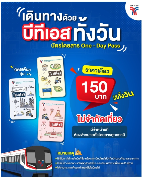 รถไฟฟ้าบีทีเอส แนะนำผู้โดยสารเดินทางด้วยรถไฟฟ้าบีทีเอส ขึ้น -ลง หลายสถานี หรือ เดินทางเที่ยวแบบ One Day Trip สามารถซื้อบัตร One – Day Pass มีจำหน่ายที่ห้องจำหน่ายตั๋วโดยสารทุกสถานี ราคา 150 บาท ใช้เดินทางได้ภายในวันที่ซื้อ หรือ ลงทะเบียนโดยไม่จำกัดจำนวนเที่ยว และระยะทาง ตั้งแต่เวลา 06.00 – 24.00 น. เหมาะสำหรับคนที่ต้องการเดินทางไปหลาย ๆ ที่ในหนึ่งวัน รวมส่วนต่อขยายทั้งหมด 60 สถานี ไม่สามารถแลกคืนมูลค่าคงเหลือในบัตรได้ สอบถามข้อมูลเพิ่มเติมที่ @btsskytrain