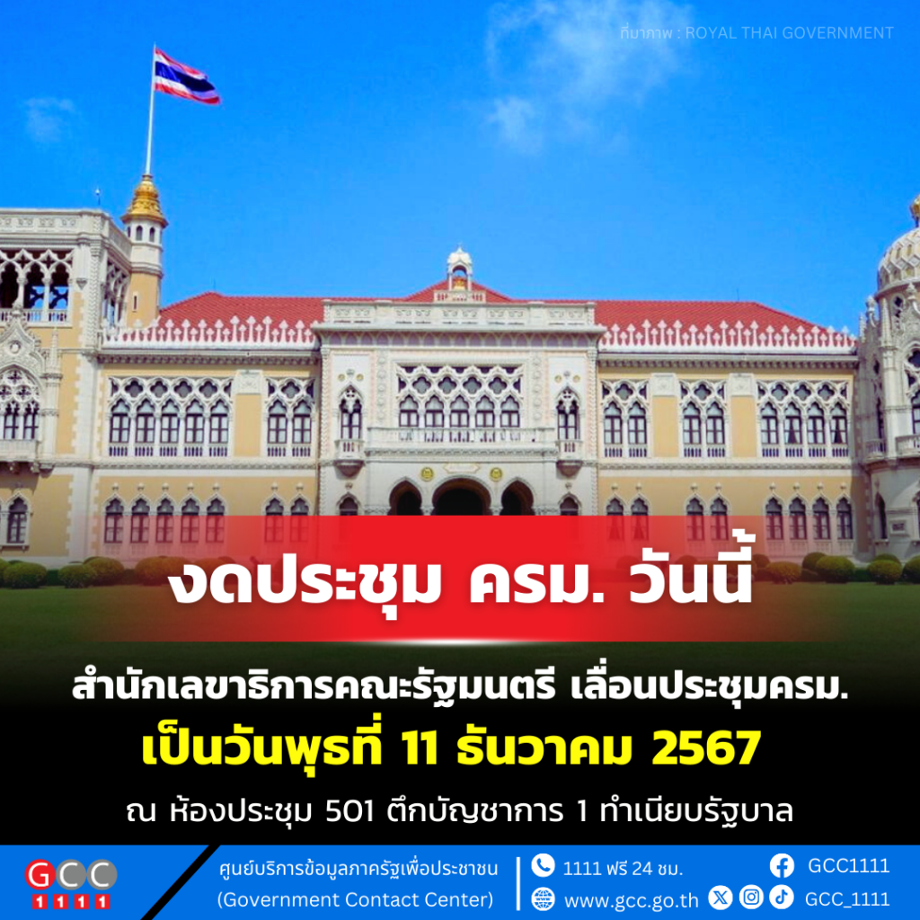 รัฐบาล เลื่อนการประชุมคณะรัฐมนตรี เป็นวันพุธที่ 11 ธันวาคม 2567 ข่าวสารกิจกรรม รัฐบาล เลื่อนการประชุมคณะรัฐมนตรี เป็นวันพุธที่ 11 ธันวาคม 2567 รัฐบาล เลื่อนการประชุมคณะรัฐมนตรี จากวันอังคารที่ 10 ธันวาคม 2567 เป็นวันพุธที่ 11 ธันวาคม 2567 ตามที่กำหนดการเดิม การประชุมคณะรัฐมนตรี กำหนดให้มีการประชุมทุกวันอังคาร แต่เนื่องจากสัปดาห์นี้เป็นวันหยุดพิเศษวันรัฐธรรมนูญ สำนักเลขาธิการคณะรัฐมนตรีจึงเลื่อนการประชุมไปเป็นวันพุธ ที่ 11 ธันวาคม 2567 เวลา 10.00 น. ณ ห้องประชุม 501 ตึกบัญชาการ 1 ทำเนียบรัฐบาล ที่มา : https://www.thaigov.go.th/news/contents/details/91197 Post Views: 15 FacebookFacebookXTwitterLINELine