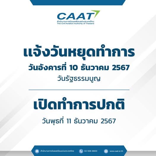 สำนักงานการบินพลเรือนแห่งประเทศไทย แจ้งวันหยุดทำการ วันอังคารที่ 10 ธันวาคม 2567 ข่าวสารกิจกรรม สำนักงานการบินพลเรือนแห่งประเทศไทย แจ้งวันหยุดทำการ วันอังคารที่ 10 ธันวาคม 2567 สำนักงานการบินพลเรือนแห่งประเทศไทย แจ้งวันหยุดทำการ วันอังคารที่ 10 ธันวาคม 2567 เนื่องในวันรัฐธรรมนูญ และจะเปิดทำการตามปกติวันพุธที่ 11 ธันวาคม 2567 ที่มา : https://citly.me/gyCNZ Post Views: 10 FacebookFacebookXTwitterLINELine