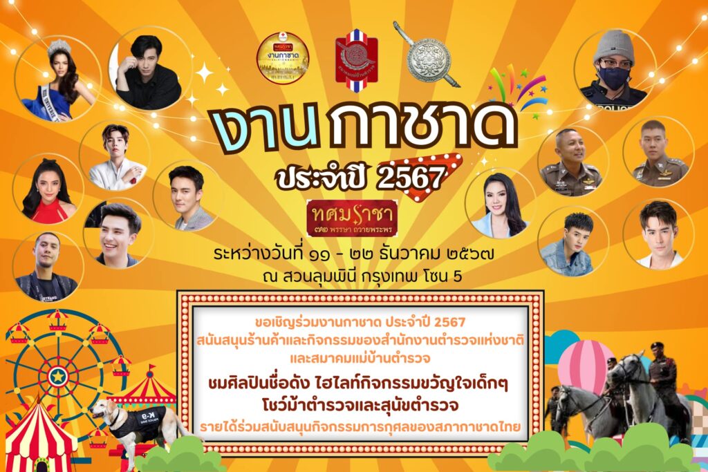 ทั้งนี้ ขอเชิญชวนประชาชนร่วมงานกาชาดประจำปี 2567 ภายใต้แนวคิด “ทศมราชา 72 พรรษา ถวายพระพร” ระหว่างวันที่ 11 – 22 ธันวาคม 2567 รวม 12 วัน ณ สวนลุมพินี กรุงเทพมหานคร เวลา 11.00 – 22.00 น. วันสุดท้ายปิด 23.00 น. และแพลตฟอร์มงานกาชาดออนไลน์ www.iredcross.org ตลอด 24 ชั่วโมง เพื่อหารายได้โดยเสด็จพระราชกุศลบำรุงสภากาชาดไทย