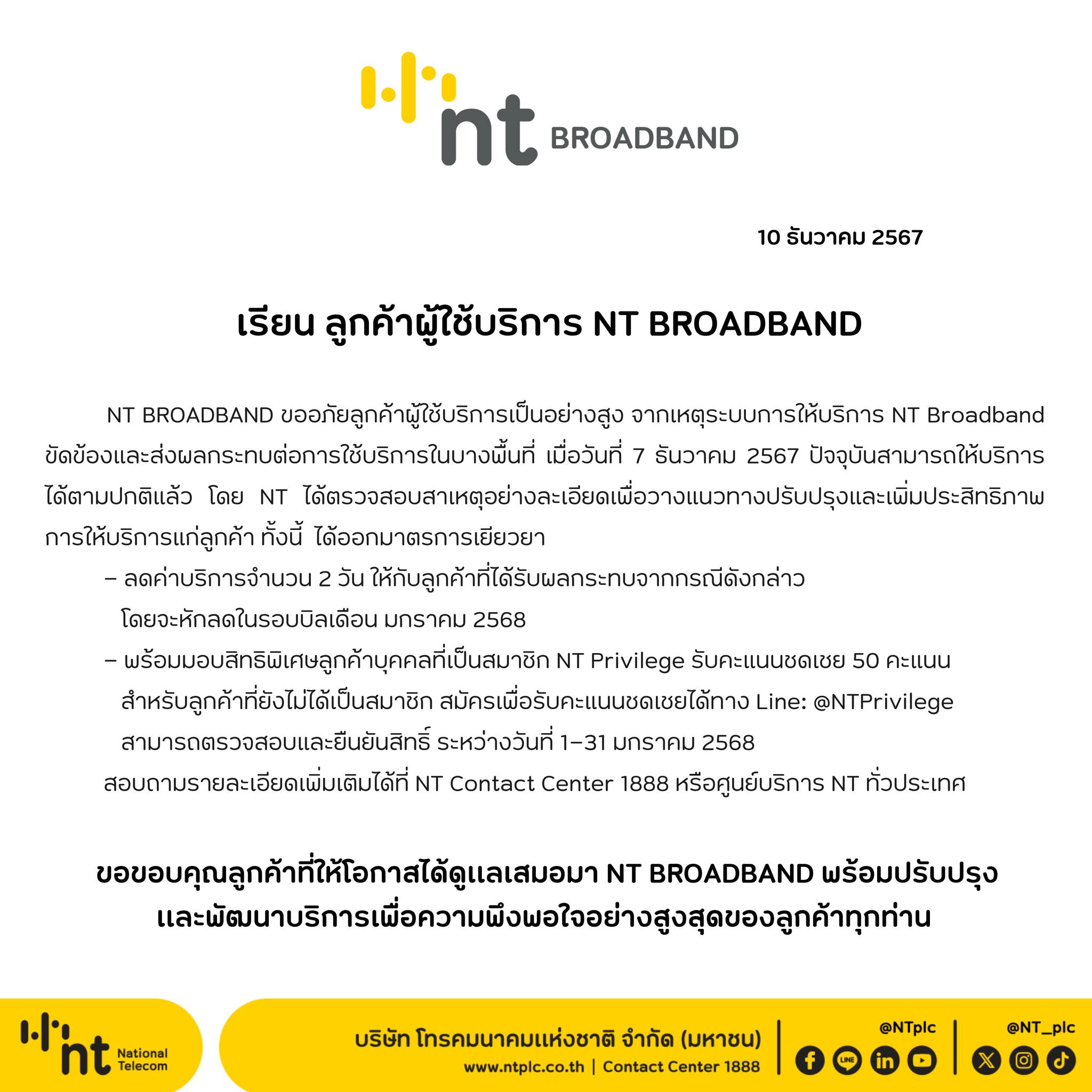 NT BROADBAND ขออภัยลูกค้าผู้ใช้บริการเป็นอย่างสูง จากเหตุระบบการให้บริการ NT Broadband ขัดข้องและส่งผลกระทบต่อการใช้บริการในบางพื้นที่ เมื่อวันที่ 7 ธันวาคม 2567 ปัจจุบันสามารถให้บริการ ได้ตามปกติแล้ว โดย NT ได้ตรวจสอบสาเหตุอย่างละเอียดเพื่อวางแนวทางปรับปรุงและเพิ่มประสิทธิภาพ การให้บริการแก่ลูกค้า ทั้งนี้ ได้ออกมาตรการเยียวยา
