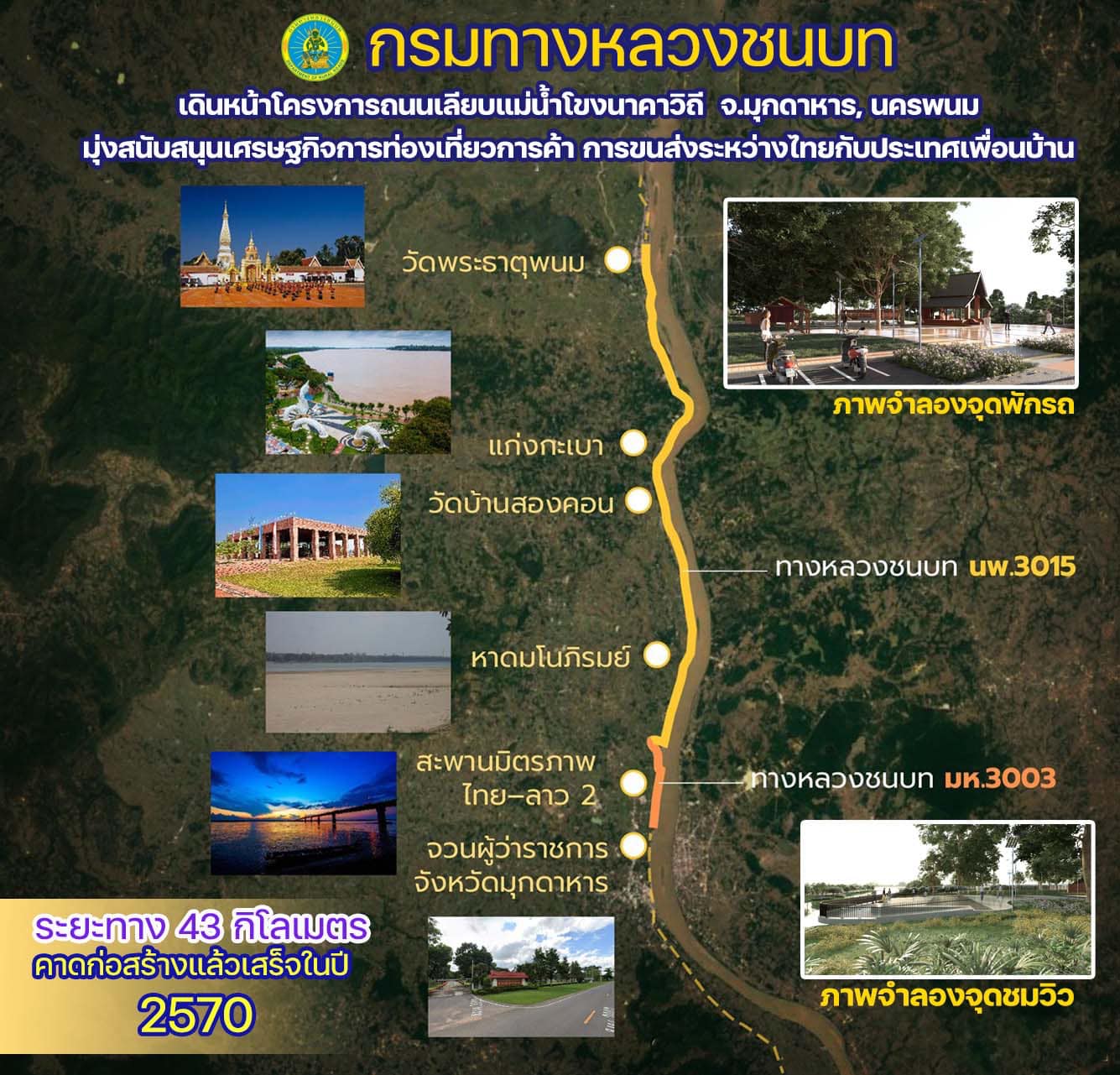 กรมทางหลวงชนบท เดินหน้าโครงการถนนเลียบแม่น้ำโขงนาคาวิถี ช่วงสะพานมิตรภาพไทย – ลาว (แห่งที่ 2) – พระธาตุพนม จ.มุกดาหาร, นครพนม กว่า 43 กิโลเมตร มุ่งสนับสนุนเศรษฐกิจการท่องเที่ยวการค้า การขนส่งระหว่างไทยกับประเทศเพื่อนบ้าน คาดก่อสร้างแล้วเสร็จในปี 2570