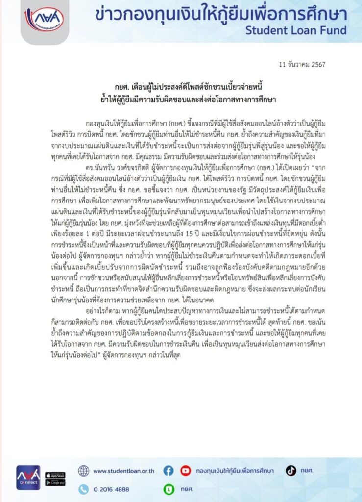 ดร.นันทวัน วงศ์ขจรกิตติ ผู้จัดการกองทุนเงินให้กู้ยืมเพื่อการศึกษา (กยศ.) ได้เปิดเผยว่า “จากกรณีที่มีผู้ใช้สื่อสังคมออนไลน์อ้างตัวว่าเป็นผู้กู้ยืมเงิน กยศ. ได้โพสต์รีวิว การบิดหนี้ กยศ. โดยชักชวนผู้กู้ยืมท่านอื่นให้ไม่ชำระหนี้คืน ซึ่ง กยศ. ขอชี้แจงว่า กยศ. เป็นหน่วยงานของรัฐ มีวัตถุประสงค์ให้กู้ยืมเงินเพื่อการศึกษา เพื่อเพิ่มโอกาสทางการศึกษาและพัฒนาทรัพยากรมนุษย์ของประเทศ โดยใช้เงินจากงบประมาณแผ่นดินและเงินที่ได้รับชำระหนี้ของผู้กู้ยืมรุ่นพี่กลับมาเป็นทุนหมุนเวียนเพื่อนำไปสร้างโอกาสทางการศึกษาให้แก่ผู้กู้ยืมรุ่นน้อง โดย กยศ. มุ่งหวังที่จะช่วยเหลือผู้ที่ต้องการศึกษาต่อสามารถเข้าถึงแหล่งเงินทุนที่มีดอกเบี้ยต่ำ เพียงร้อยละ 1 ต่อปี มีระยะเวลาผ่อนชำระนานถึง 15 ปี และมีเงื่อนไขการผ่อนชำระหนี้ที่ยืดหยุ่น ดังนั้น การชำระหนี้จึงเป็นหน้าที่และความรับผิดชอบที่ผู้กู้ยืมทุกคนควรปฏิบัติเพื่อส่งต่อโอกาสทางการศึกษาให้แก่รุ่นน้องต่อไป ผู้จัดการกองทุนฯ กล่าวย้ำว่า หากผู้กู้ยืมไม่ชำระเงินคืนตามกำหนดจะทำให้เกิดภาระดอกเบี้ยที่เพิ่มขึ้นและเกิดเบี้ยปรับจากการผิดนัดชำระหนี้ รวมถึงอาจถูกฟ้องร้องบังคับคดีตามกฎหมายอีกด้วย นอกจากนี้ การชักชวนหรือสนับสนุนให้ผู้อื่นหลีกเลี่ยงการชำระหนี้หรือโอนทรัพย์สินเพื่อหลีกเลี่ยงการบังคับชำระหนี้ ถือเป็นการกระทำที่ขาดจิตสำนึกความรับผิดชอบและผิดกฎหมาย ซึ่งจะส่งผลกระทบต่อนักเรียน นักศึกษารุ่นน้องที่ต้องการความช่วยเหลือจาก กยศ. ได้ในอนาคต