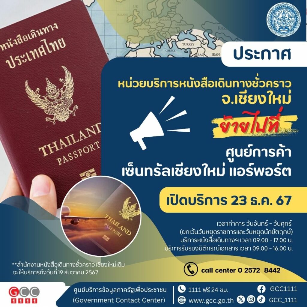 กรมการกงสุล ประกาศสำนักงานหนังสือเดินทางชั่วคราว เชียงใหม่ ย้ายไปที่ ศูนย์การค้าเซ็นทรัลเชียงใหม่ แอร์พอร์ต เปิดให้บริการวันที่ 23 ธันวาคม 2567 เวลาทำการวันจันทร์ – วันศุกร์ (ยกเว้นวันหยุดราชการและวันหยุดนักขัตฤกษ์) บริการหนังสือเดินทางฯ เวลา 09.00 – 17.00 น. บริการรับรองนิติกรณ์เอกสาร เวลา 09.00 – 16.00 น. หมายเหตุ : สำนักงานหนังสือเดินทางชั่วคราว เชียงใหม่เดิม (อาคารรวงผึ้ง ศูนย์ประชุมและแสดงสินค้านานาชาติเฉลิมพระเกียรติ 7 รอบ พระชนมพรรษา) จะให้บริการถึงวันที่ 19 ธันวาคม 2567
