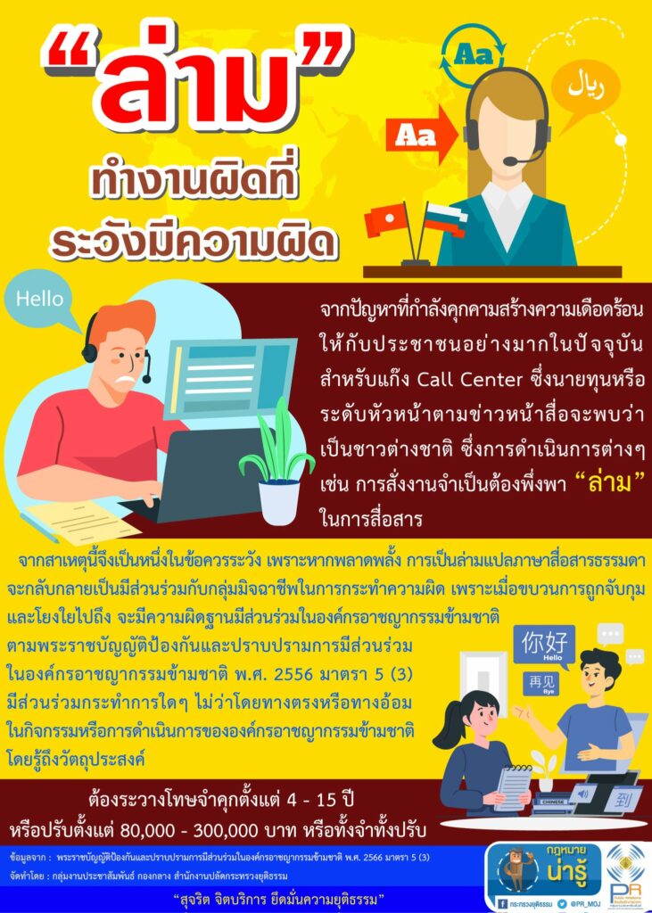 กระทรวงยุติธรรม แนะนำกฎหมายน่ารู้ ชื่อตอน : “ล่าม” ทำงานผิดที่ระวังมีความผิด ข้อมูลจาก : พระราชบัญญัติป้องกันและปราบปรามการมีส่วนร่วมในองค์กรอาชญากรรมข้ามชาติ พ.ศ. 2566 มาตรา 5 (3)