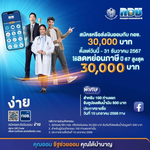 กองทุนการออมแห่งชาติ เชิญชวนสมัครหรือส่งเงินออม ตั้งแต่บัดนี้ – 31 ธ.ค. 67 ใช้ลดหย่อนภาษี สูงสุด 30,000 บาท ข่าวสารกิจกรรม กองทุนการออมแห่งชาติ เชิญชวนสมัครหรือส่งเงินออม ตั้งแต่บัดนี้ – 31 ธ.ค. 67 ใช้ลดหย่อนภาษี สูงสุด 30,000 บาท กองทุนการออมแห่งชาติ เชิญชวนสมัครหรือส่งเงินออม ตั้งแต่บัดนี้ – 31 ธันวาคม 2567 ใช้ลดหย่อนภาษี สูงสุด 30,000 บาท พิเศษ สำหรับ 100 ท่านแรก รับทันที คูปองเติมน้ำมันฟรี มูลค่า 500 บาท ประกาศรายชื่อผู้โชคดี วันที่ 10 มกราคม 2568 ที่มา : https://citly.me/ImDVC Post Views: 9 FacebookFacebookXTwitterLINELine