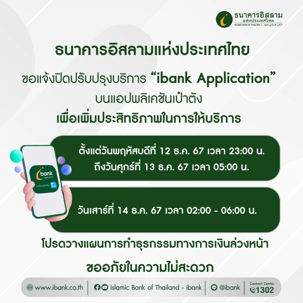 ธนาคารอิสลามแห่งประเทศไทย แจ้งปิดปรับปรุงบริการ ibank Application วันที่ 12-14 ธันวาคม 2567