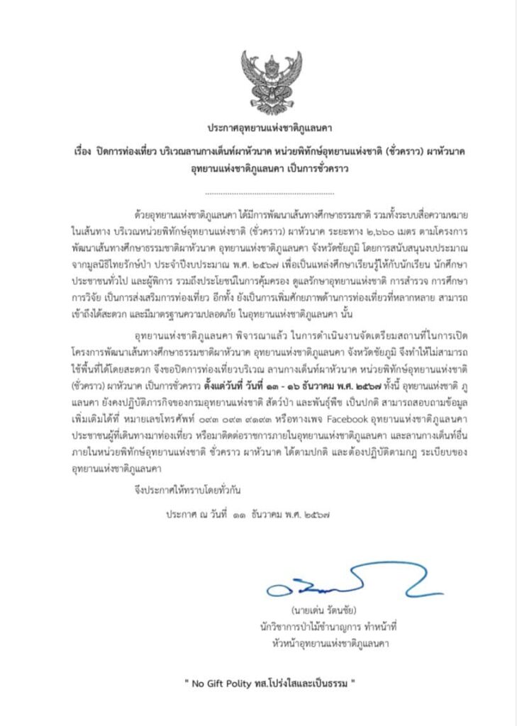 อุทยานแห่งชาติภูแลนคา แจ้งปิดการท่องเที่ยวบริเวณ ลานกางเต็นท์ผาหัวนาค เป็นการชั่วคราว ข่าวสารกิจกรรม อุทยานแห่งชาติภูแลนคา แจ้งปิดการท่องเที่ยวบริเวณ ลานกางเต็นท์ผาหัวนาค เป็นการชั่วคราว อุทยานแห่งชาติภูแลนคา แจ้งปิดการท่องเที่ยวบริเวณ ลานกางเต็นท์ผาหัวนาค เป็นการชั่วคราว วันที่ 13 – 16 ธันวาคม 2567 ทั้งนี้ นักท่องเที่ยวสามารถเข้าเยี่ยมชมบรรยากาศ และพักแรมที่ลานกางเต็นท์ดงสน และถ่ายภาพจุดชมวิวภูแลนคา หรือจุดเช็คอินอื่นๆ ได้ตามปกติ ที่มา : https://citly.me/RdNWX Post Views: 29 FacebookFacebookXTwitterLINELine