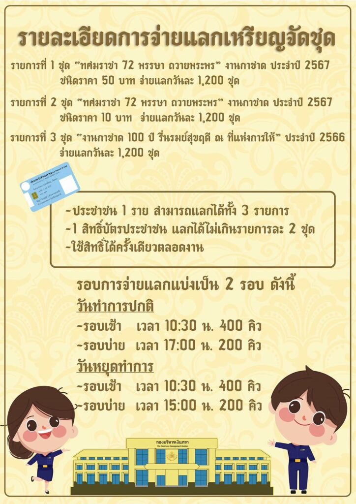 1. ชุด “ทศมราชา 72 พรรษา ถวายพระพร” งานกาชาด ประจำปี 2567 ชนิดราคา 50 บาท (จ่ายแลกวันละ 1,200 ชุด)