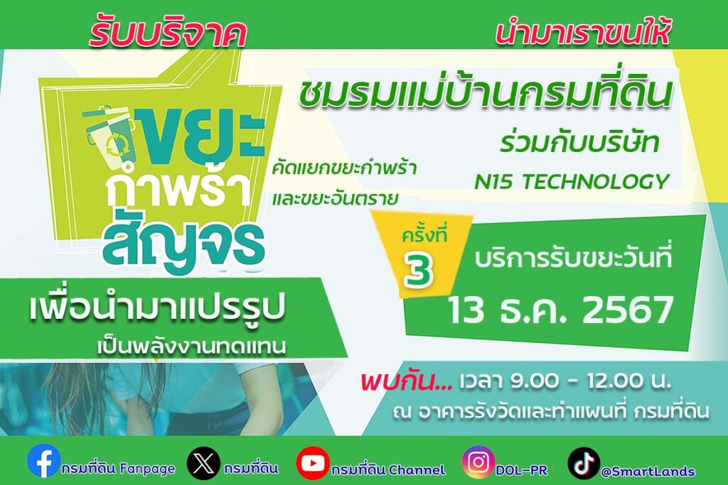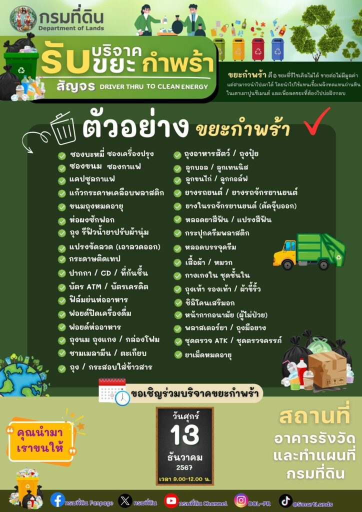 กรมที่ดิน เชิญร่วมบริจาคขยะกำพร้าสัญจร ครั้งที่ 3 เพื่อนำมาแปรรูปเป็นพลังงานทดแทน วันศุกร์ที่ 13 ธันวาคม 2567 ตั้งแต่เวลา 9.00 – 12.00 น. ณ อาคารรังวัดและทำแผนที่ อำเภอปากเกร็ด จังหวัดนนทบุรี