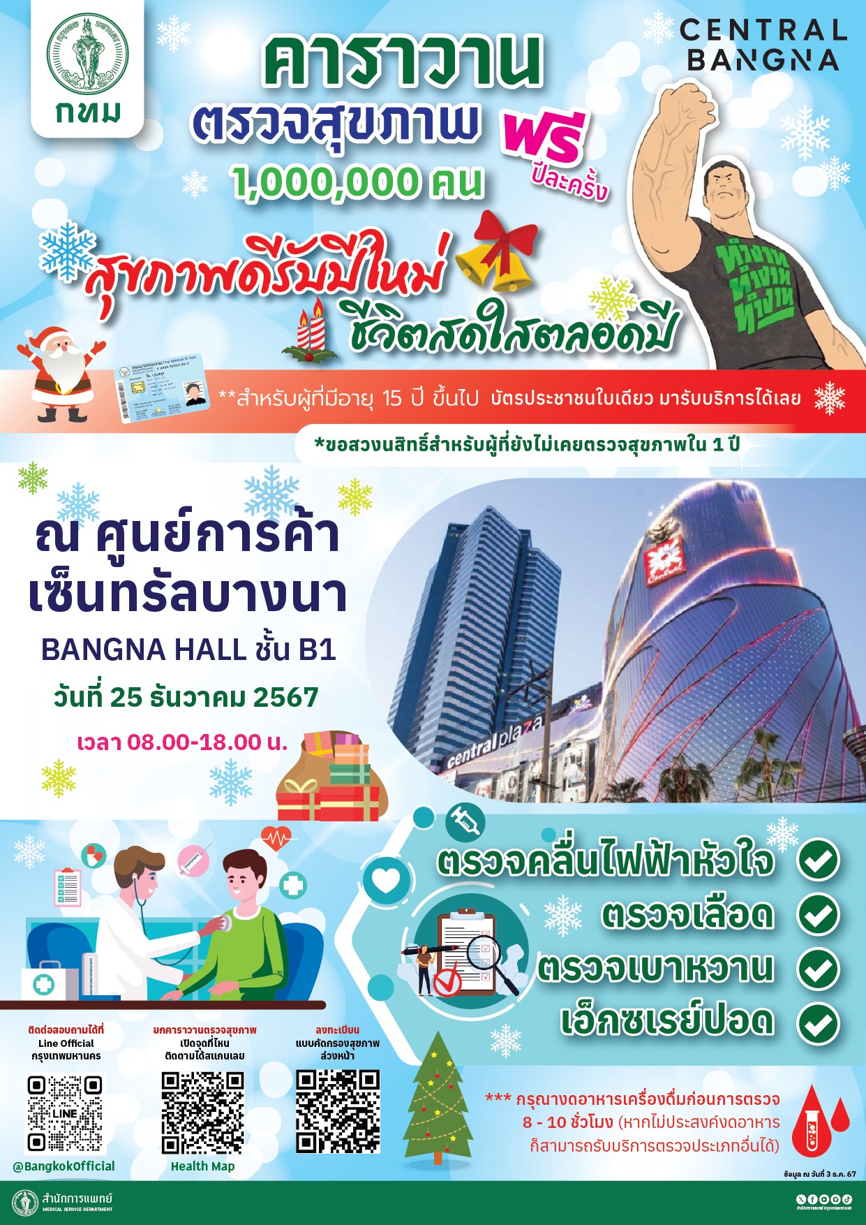 กรุงเทพมหานคร ขอเชิญชวนประชาชนมาตรวจ “สุขภาพดีรับปีใหม่ ชีวิตสดใสตลอดปี” ตรวจสุขภาพฟรี กับคาราวานตรวจสุขภาพล้านคนฟรี โดยสำนักการแพทย์ กรุงเทพมหานคร ร่วมกับศูนย์การค้าเซ็นทรัล บางนา มอบของขวัญสุดพิเศษแห่งปีให้กับประชาชนที่มีอายุ 15 ปีขึ้นไป ในวันที่ 25 ธันวาคม 2567 เวลา 08.00 – 18.00 น. ณ Bangna Hall ชั้น B1