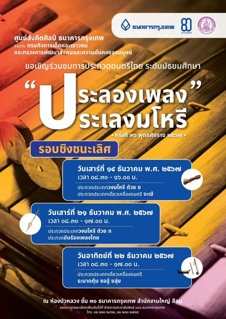 กรมกิจการเด็กและเยาวชน เชิญเข้าร่วมการประกวดดนตรีไทย ระดับมัธยมศึกษา “ประลองเพลง ประเลงมโหรี” ครั้งที่ 36 ประจำปี 2567 (รอบชิงชนะเลิศ)