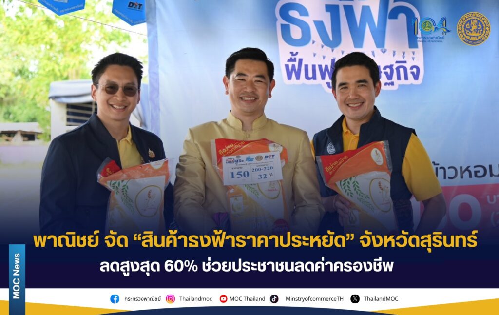 กระทรวงพาณิชย์เดินหน้าขับเคลื่อนนโยบายลดภาระค่าครองชีพให้ประชาชน จัด “สินค้าธงฟ้าราคาประหยัด” จังหวัดสุรินทร์ นำสินค้าอุปโภค-บริโภคจากผู้ผลิต ผู้ประกอบการ และกลุ่มเกษตรกรในพื้นที่กว่า 200 รายการ ลดราคาสูงสุดถึง 60% พร้อมจัดจำหน่ายสินค้าไฮไลท์ในราคาพิเศษ