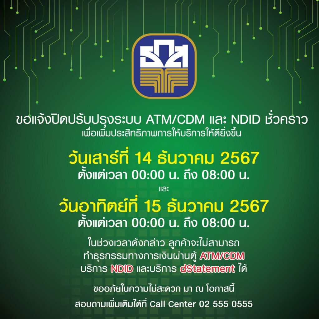 ธ.ก.ส. แจ้งปิดปรับปรุงระบบ ATM/CDM และ NDID ชั่วคราว ในวันเที่ 14 – 15 ธันวาคม 2567 ข่าวสารกิจกรรม ธ.ก.ส. แจ้งปิดปรับปรุงระบบ ATM/CDM และ NDID ชั่วคราว ในวันเที่ 14 – 15 ธันวาคม 2567 ธนาคารเพื่อการเกษตรและสหกรณ์การเกษตร แจ้งปิดปรับปรุงระบบ ATM/CDM และ NDID ชั่วคราว ในวันเสาร์ที่ 14 ธันวาคม 2567 ตั้งแต่เวลา 00:00 – 08:00 น. และ วันอาทิตย์ที่ 15 ธันวาคม 2567 ตั้งแต่เวลา 00:00 – 08:00 น. เพื่อเพิ่มประสิทธิภาพและการบริการให้ดียิ่งขึ้น ในช่วงเวลาดังกล่าว ลูกค้าจะไม่สามารถทำธุรกรรมผ่านตู้ ATM/CDM บริการ NDID และบริการ dStatement ได้ ที่มา : https://citly.me/3y7Xt Post Views: 9 FacebookFacebookXTwitterLINELine