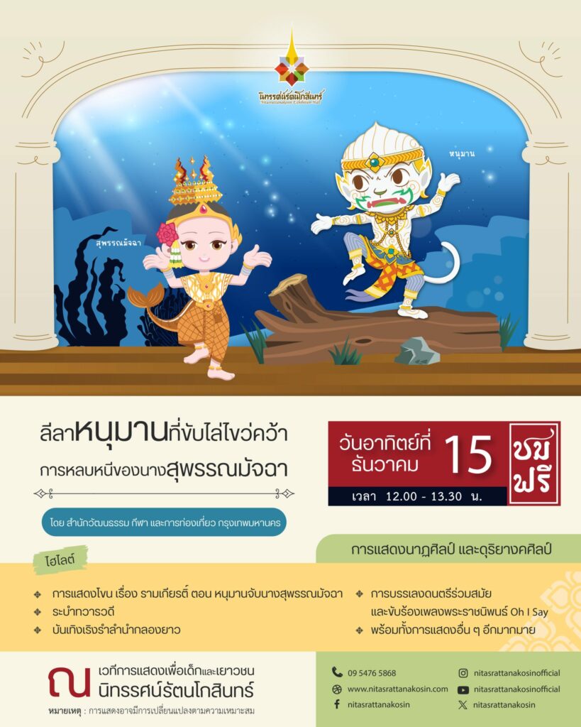 - การแสดงโขน เรื่อง รามเกียรติ์ ตอน หนุมานจับนางสุพรรณมัจฉา